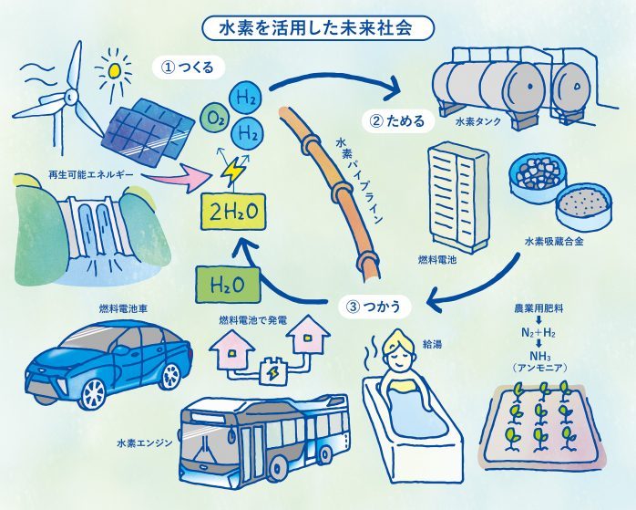 背景にあるのは、地球温暖化対策です。水素は燃やしても二酸化炭素を出しません。つまり、環境への負荷が少ないのです。しかも空気中に放つと1秒間で50mも拡散するため、漏れ出しても燃えたりする危険性が低いのです。しかも電力を水素に変換する技術が開発されたことで、天然ガスのパイプラインを使って遠隔地に運んだり、水素吸蔵合金という金属に貯めてトラックなどで運搬したりすることも可能になっています。つまりとても使い勝手がいいのです。