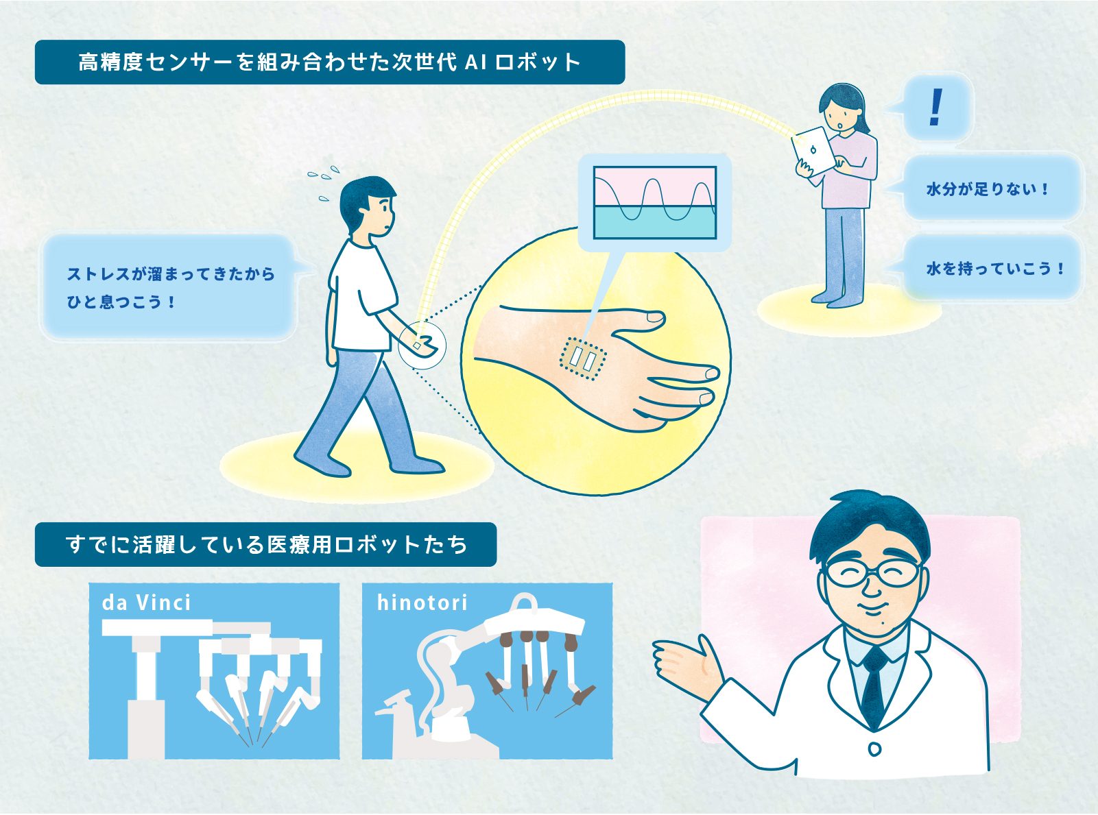 たとえば私の研究室では、身体に貼ったセンサを使って体のpH値などを計測する技術の開発を進めています。知っている人も多いかも知れませんが、人は年齢を重ねると、のどの渇きや暑さを感じにくくなります。若い人でも何かに熱中するあまり、気がついたら脱水症状に掛かっていたという経験のある人も多いのではないでしょうか。体表面のpH値を計測して、普段のその人のデータを組み込んだAIで分析できれば、AIが「水分が足りてないよ。水を飲んで」と警告できるようになります。