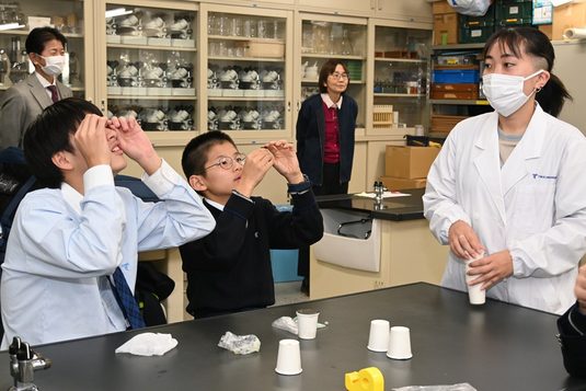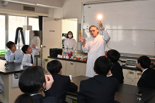 工学部応用化学科の秋山泰伸教授と学生が11月29日に、付属相模高校中等部で「ドクターアキヤマの理科実験教室」を開催しました。中学生に科学の魅力や楽しさを伝え、“理科離れ”を防ぐことを目的とした高大連携の取り組みです。同校の自然科学部に所属する生徒ら21名が参加しました。