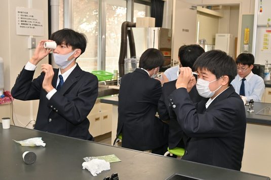 今回は、「色と光」をテーマに3つの実験を行いました。初めに、秋山教授が光の3原色について説明し、光を波長ごとに分光する回折格子シートを配布。生徒たちはシート越しに白熱灯と蛍光灯、LEDライトを見比べ、色の見え方の違いを体験的に学びました。続いて、シアン・マゼンタ・イエローの3色の液体を使ったスライム作りを実施。秋山教授が光の3原色と色の3原色の関係やスライムが固まる原理を説明し、一人ひとり好みの色でオリジナルのスライムを作成しました。最後に、液晶ディスプレイの画像が見える仕組みを解説したうえで、紙コップや画用紙、偏光板などを使った万華鏡作りに取り組みました。生徒からは、「最近授業で学んだばかりの光に関する実験だったので、教科書に書いてある内容とつながる部分があり面白かった」「スライムや万華鏡などの工作がとても楽しかった。今まで以上に、理科や化学に興味がわきました」といった声が聞かれました。
