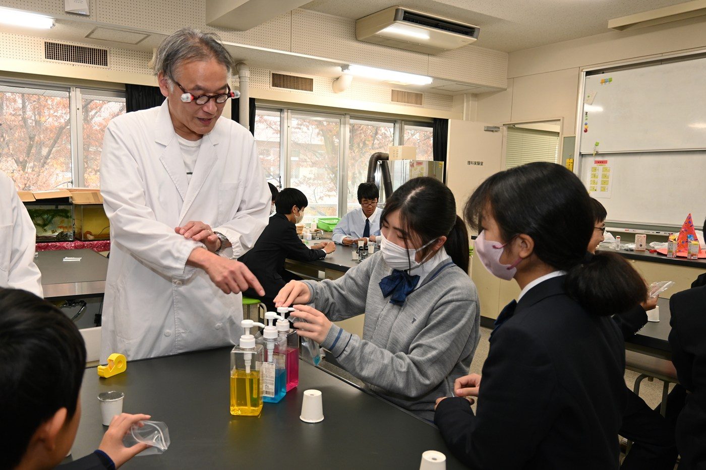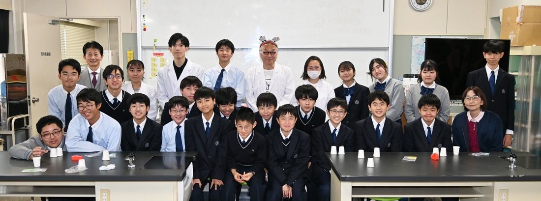 工学部応用化学科の秋山泰伸教授と学生が11月29日に、付属相模高校中等部で「ドクターアキヤマの理科実験教室」を開催しました。中学生に科学の魅力や楽しさを伝え、“理科離れ”を防ぐことを目的とした高大連携の取り組みです。同校の自然科学部に所属する生徒ら21名が参加しました。