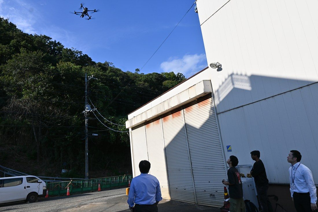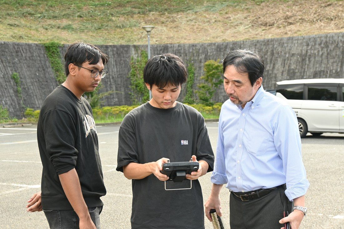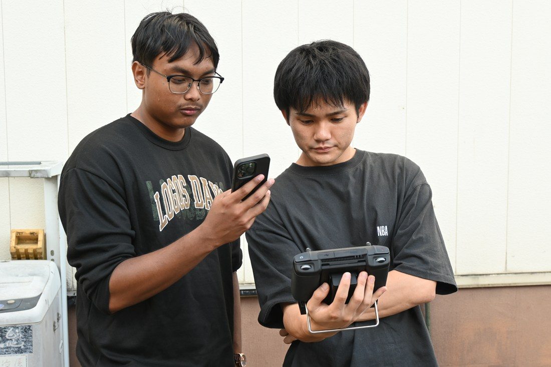 計測には工学部の4年次生2人も参加。機材の準備や操作などを担当しました。山口真生さんは、「ドローン操作の経験を積んできましたが、これほど広域の観察に立ち会うのは初めての経験。実際に現場でどのように運用すればよいのか、とても勉強になりました」とコメント。マレーシア出身のムハンマド・ハファスズッティンさんは、「技術者として日本企業に就職することになっているので、今日の貴重な経験は必ず役立つと思います」と話しました。