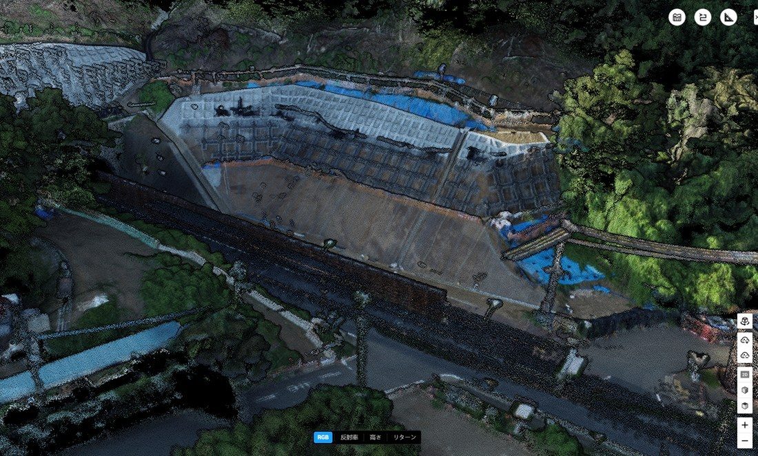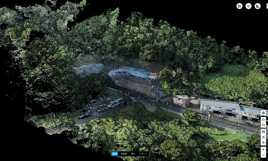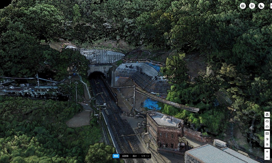今回は、伊勢原市危機部危機管理課の担当者立ち合いのもと、昨年8月30日の台風10号に伴う豪雨により崩落し、現在は復旧工事が進められている国道246号新善波トンネル付近と塔の山緑地公園を計測しました。9月24日には新善波トンネル付近の土砂崩落現場周辺を、10月21日には塔の山緑地公園近隣のがけ崩れ現場の上空に3次元レーザースキャンセンサとサーマルカメラを搭載したドローンを飛ばし、約500m四方の範囲を計測。現場の全容を把握できる詳細で鮮明な3次元マップ作成しました。