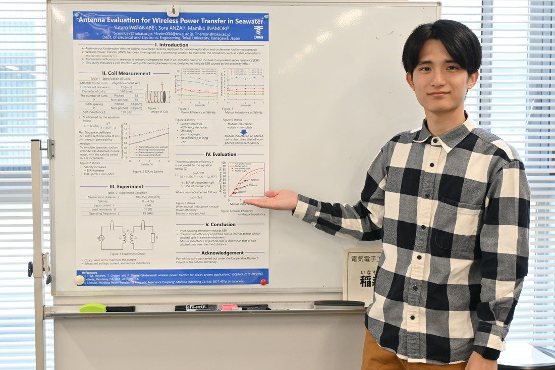 渡邉さんは、「海水中におけるワイヤレス電力伝送システムのアンテナ評価」をテーマに発表しました。近年、海底探査や水中施設の保守のために導入されている自律型水中ロボットに不可欠なワイヤレス電力伝送は、ケーブル接続やバッテリー容量などの制限を克服する有望な解決策として注目されています。海水中での伝送効率は空気中に比べて低下しますが、損失が増加します。渡邉さんの研究は、その損失を解析するために設計されたターン間のピッチ間隔を持つコイル構造を評価したものです。