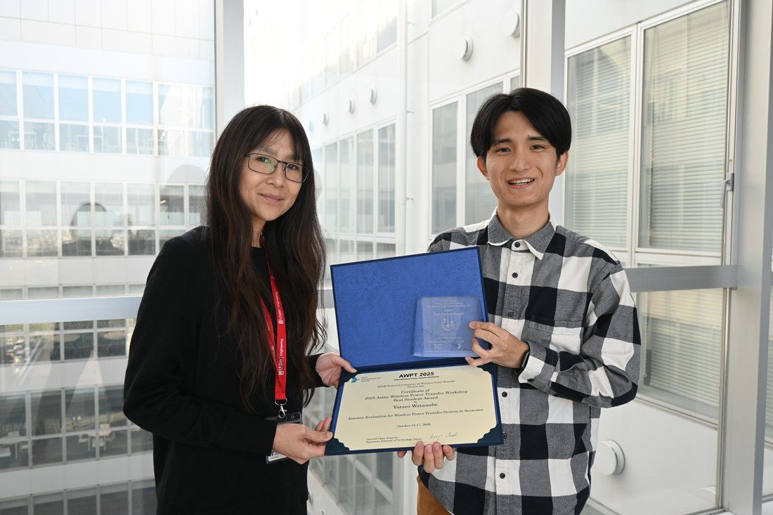 大学院工学研究科電気電子工学専攻1年次生の渡邉雄太朗さん(指導教員=工学部電気電子工学科・稲森真美子准教授)が、10月15日から17日までタイのキングモンクット工科大学北バンコク校(KMUTNB)で開催された「アジアワイヤレス電力伝送ワークショップ(AWPT)2025」のヤングエンジニアセッションに参加。最優秀学生賞を受賞しました。AWPTは、ワイヤレス電力伝送技術に関する最新の技術や研究開発に関する動向の共有を目的に開かれており、専門家・研究者らによる技術的な課題や最先端の解決策をめぐる発表や議論が交わされ、若手研究者の活躍も促進しています。