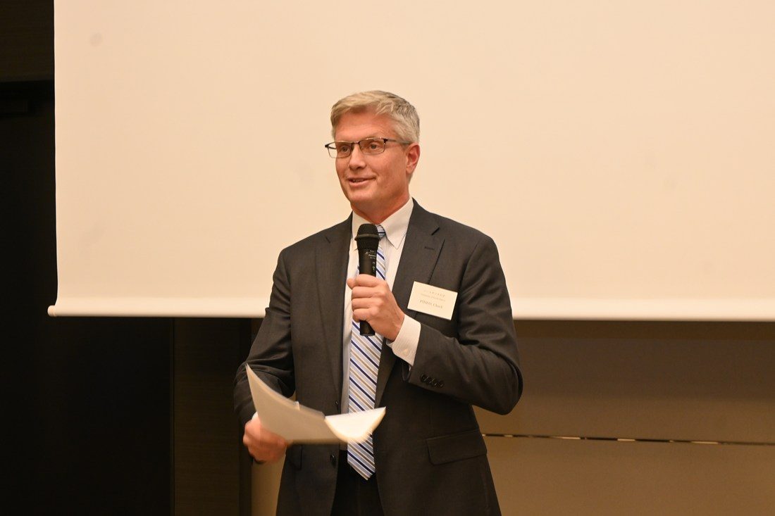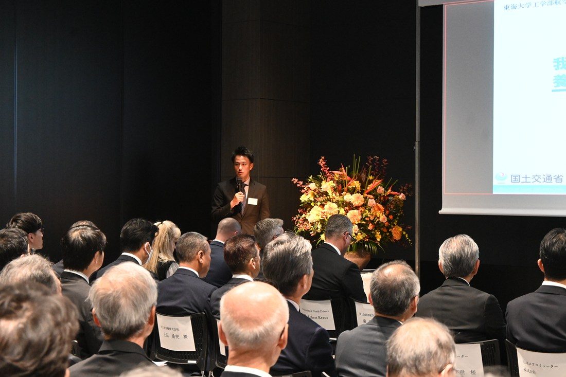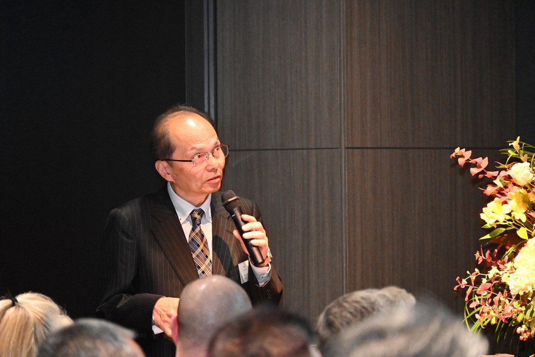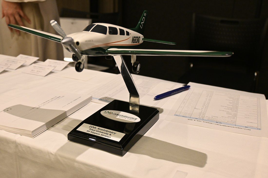 その後、本学の稲津敏行学長補佐の発声で乾杯。UNDエアロスペースファウンデーションのチャック・ピネオCEOが、「私たちが共に成し遂げてきたことは本当に素晴らしい。アメリカと日本の両国から認定を受けた特別な航空プログラムであり、私たち全員が誇りに思うべきことだと思います。プログラムに対する皆さまの献身的な取り組みと友情に感謝します」と祝意を述べました。会場では参加者同士が懇談。卒業生によるプレゼンテーションも行われ、就職してから現在までの日々や同窓会の活動が紹介されました。最後にサイエンス・エンジニアリングカレッジプロボストの梶田佳孝学長補佐(建築都市学部教授)が閉会の辞を述べて会を締めくくりました。