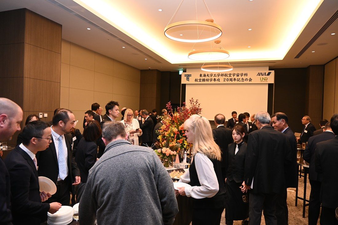 工学部航空宇宙学科航空操縦学専攻がこのほど設立20周年を迎え、12月5日に東京・ベルサール羽田空港で記念の会を開催しました。本専攻は、日本の大学で初となるエアラインパイロット養成コースとして2006年度に開設。全日本空輸株式会社(ANA)の全面的協力による産学連携とアメリカ・ノースダコタ大学(UND)との留学協定、国土交通省航空局の支援のもと、約1年半にわたるUNDでの飛行訓練を通じてアメリカと日本の操縦士ライセンスを取得できるカリキュラムで、これまでに460 名を超える卒業生がパイロットとして活躍しています。記念の会には、監督官庁である国土交通省航空局安全部安全政策課乗員政策室室長の藏智彦氏、全日本空輸株式会社取締役執行役員・フライトオペレーションセンター長の阪部亮氏をはじめとする航空産業関係者、木村英樹学長ら本学関係者と卒業生ら約70名が参加しました。