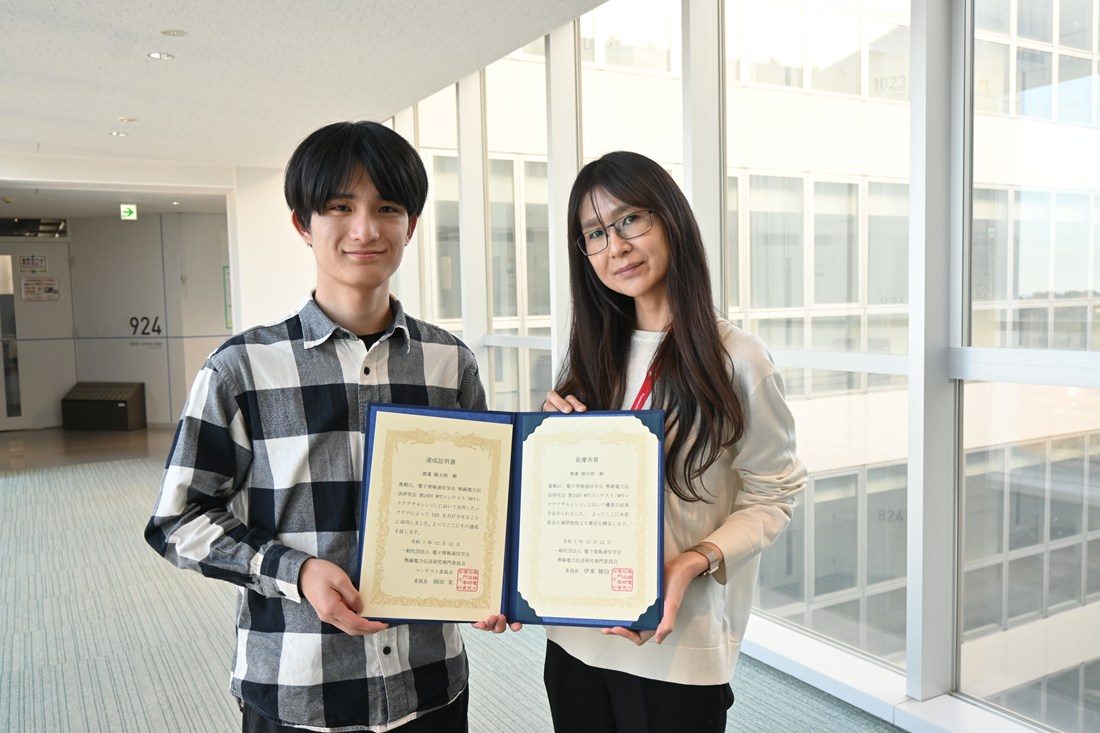 渡邉さんは、「普段の研究ではあまり扱わない電磁波を専門に研究している方たちと一緒にコンテストに参加し、企業で開発に携わる方にも直接質問できたことは、大きな刺激になりました。かつて興味のおもむくままに回路解析をした経験が役立ち、物怖じせずに臨めたので、さまざまなことに興味を持って挑戦することが大切だとあらためて実感しました。この経験を生かし、専門以外の分野にもアンテナを張り、チャンスをつかんで研究を深めていきたいと思います」と話しました。稲森准教授は、「渡邉さんは、分からないことがあったら同じラボの友人や先輩に聞き、自分で実験して試すという順序立てた研究姿勢を持っています。研究や実験分野でもAIの活用が進む中、周囲とコミュニケーションを取りながらものごとを進める姿勢はますます重要になるでしょう」と話しています。