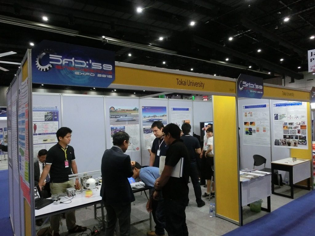 両研究室では、現在取り組んでいる研究の成果を紹介するポスターを展示したほか、デモンストレーションも実施。また、本学の活動を紹介するブースも設け、国際教育センターの山本佳男所長(工学部精密工学科教授)やバンコク市内にある本学アセアンオフィスのスタッフが、大学院への進学相談に応じました。本学のブースには多くの来場者が訪れ、参加した両研究室に所属する6名の学生たちは慣れない英語に苦心しながらも、熱心に説明にあたりました。また6名のうち4名は本学の研修プログラムを使ってKMITLに留学した経験があったことから、研修の際に友人となったKMITLの学生も来場し、再会を喜ぶ姿も見られました。