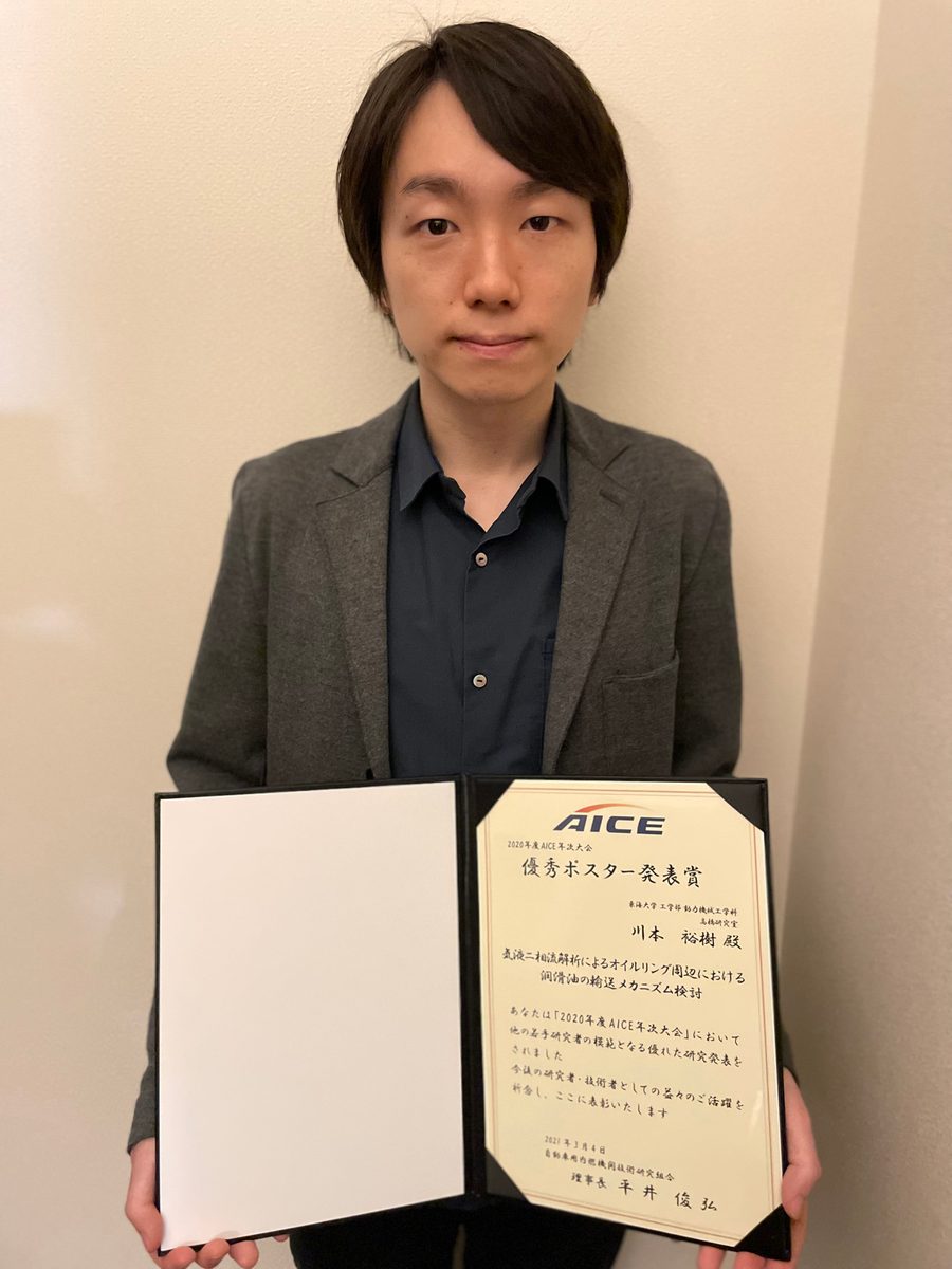 工学部博士研究員の川本裕樹さんが、3月4日にオンラインで開催された「自動車用内燃機関技術研究組合(AICE)年次大会」で優秀ポスター賞を受賞しました。同団体は、2014年に日本の自動車メーカー9社と研究機関2団体によって設立され、産学官連携を通した日本の技術力の強化と次世代をリードする人材の育成を目指しています。今回の年次大会では、各研究者がオンライン上で成果をポスター発表し、参加者によるアンケート投票で優秀ポスター賞を選出。4月22日にAICEのホームページ上で結果が発表されました。