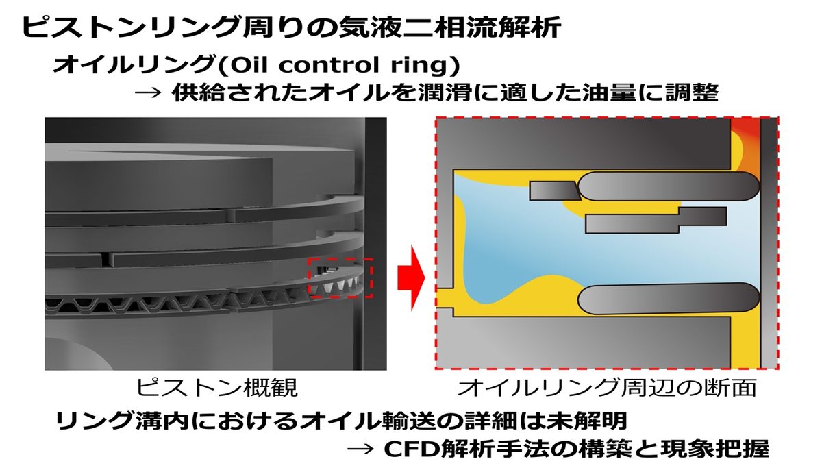 今回、川本さんは本学部の落合成行教授や畔津昭彦教授、高橋俊准教授とともに研究を重ねてきた「気液二相流解析によるオイルリング周辺における潤滑油の輸送メカニズム検討」について発表。オイルリングは、エンジン内でシリンダを潤滑した後の余分なエンジンオイルをかき落とす役割を持ち、本研究では空気と油など性質の異なる2種類の物質の挙動を調べる「二相流解析」でオイル輸送の流れを可視化することに成功しました。
