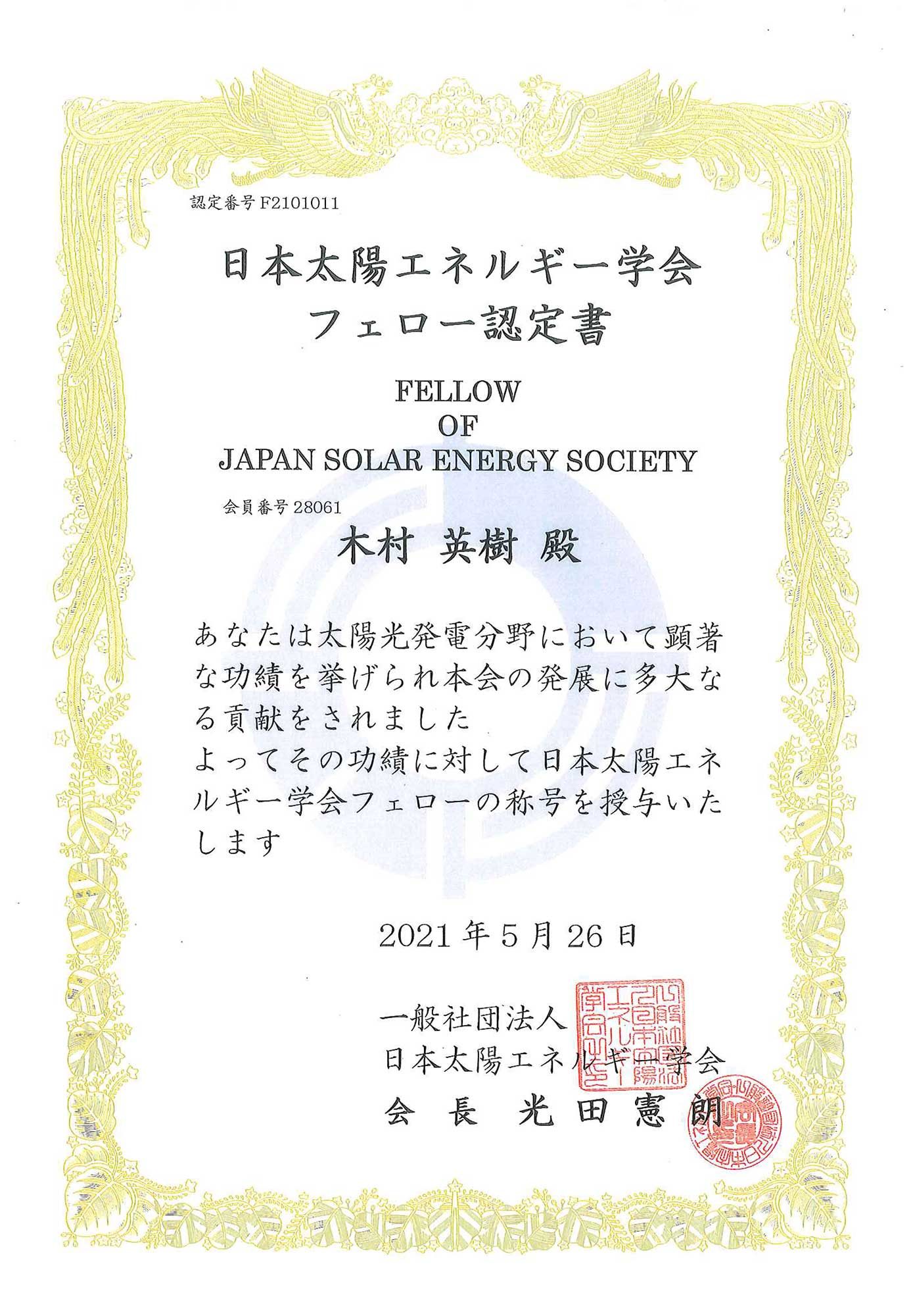 工学部電気電子工学科の木村英樹教授がこのほど 、一般社団法人日本太陽エネルギー学会から太陽光発電分野で顕著な功績を挙げたとして「日本太陽エネルギー学会フェロー」の称号認定を受けました。この称号は、太陽エネルギー関連技術分野の見識に優れ、責任ある立場で長年にわたり指導的役割を果たすとともに学会の発展に顕著な貢献をなした会員に与えられるものです。