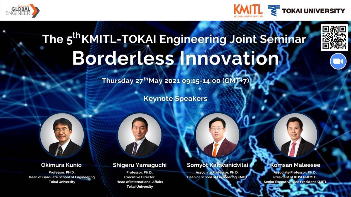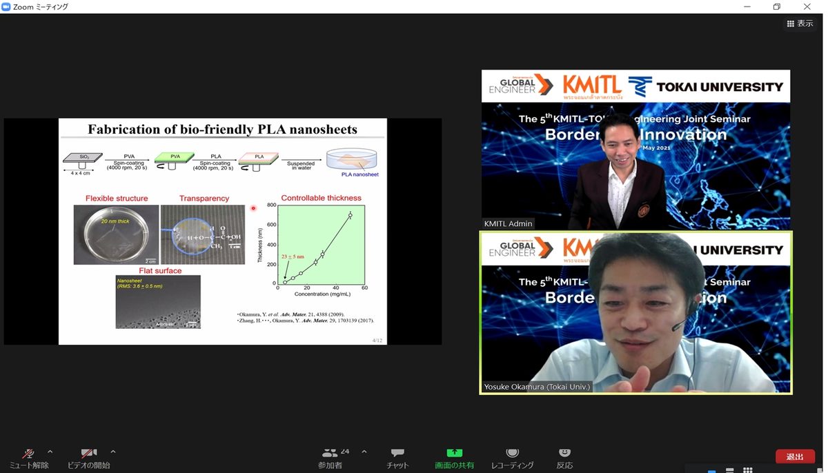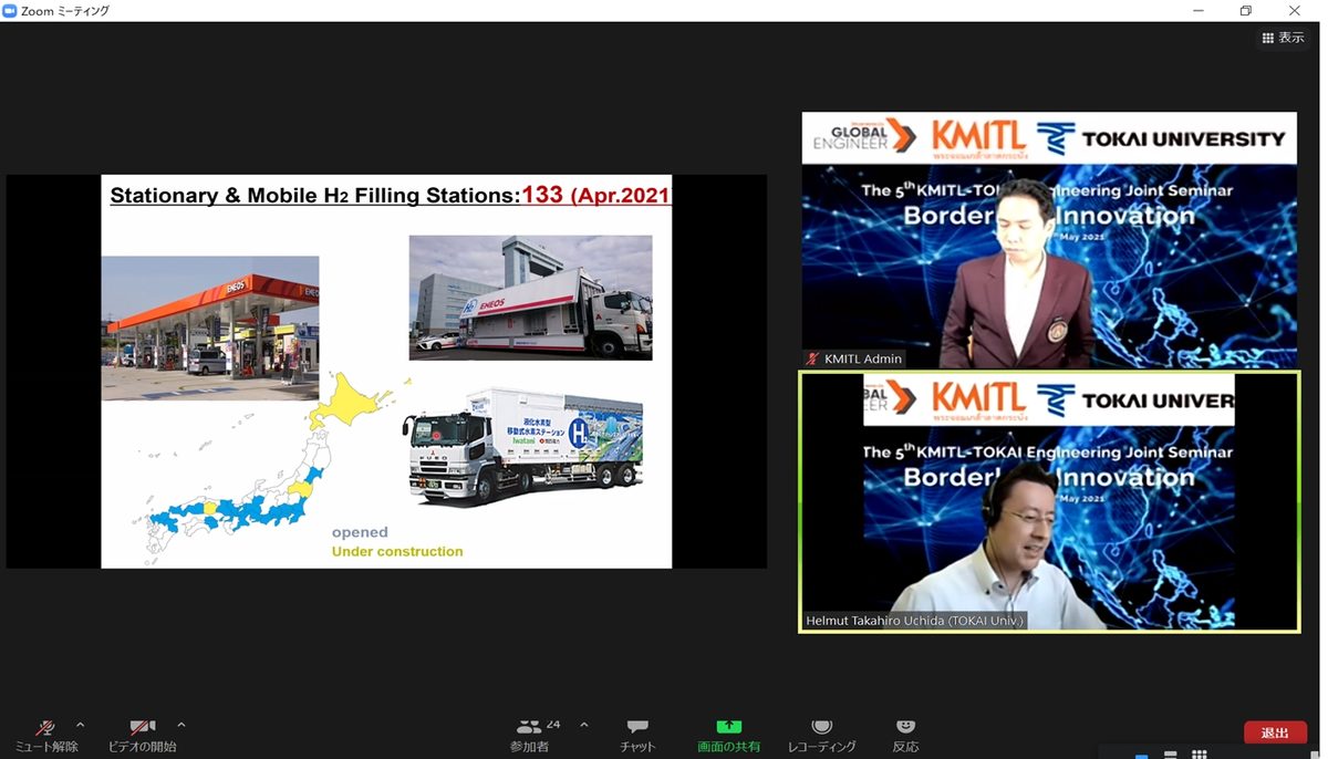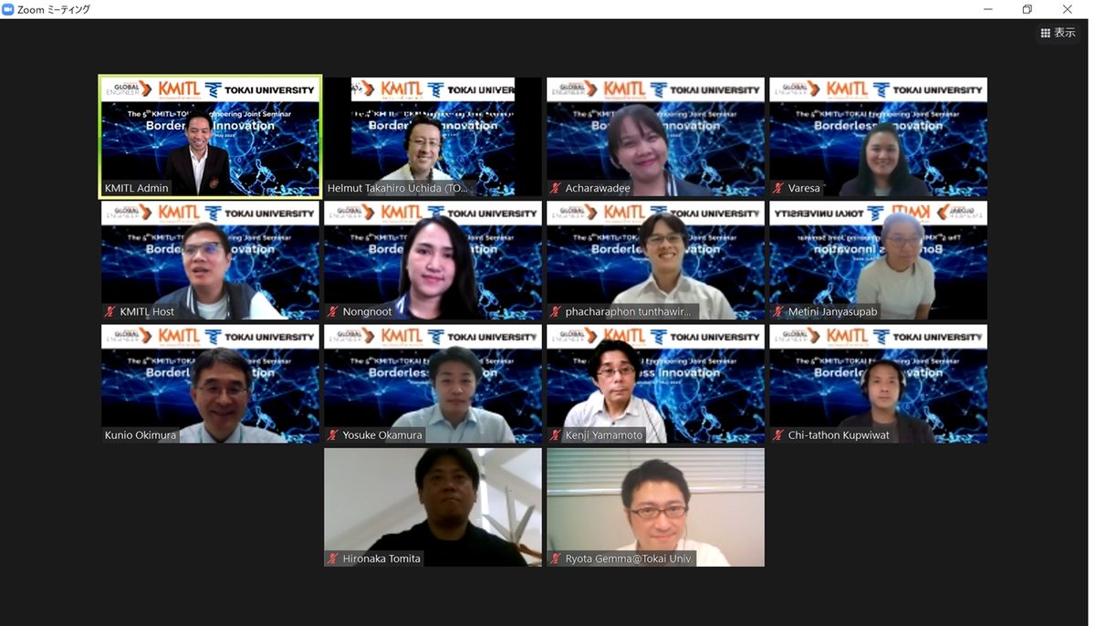 東海大学とタイ・モンクット王ラカバン工科大学(KMITL)では、5月27日にオンラインで、「KMITL-Tokai Joint Seminar 2021」を開催しました。このセミナーは、KMITLの工学部と本学工学部、情報理工学部および大学院工学研究科の研究交流の機会として2016年度から実施しているものです。19年度まではKMITLと本学湘南キャンパスで交互に開き、研究発表とともにキャンパス内の施設見学などを実施してきました。しかし、昨年度は新型コロナウイルス感染症の拡大を受けて中止に。今年度はオンラインで両大学をつないで開催しました。
