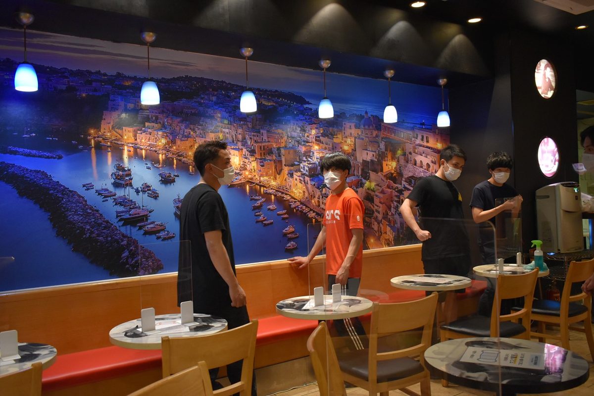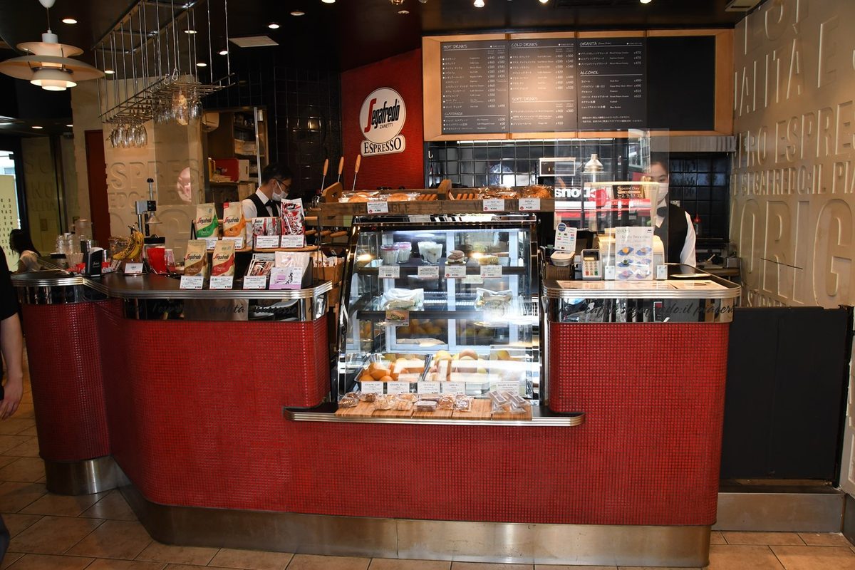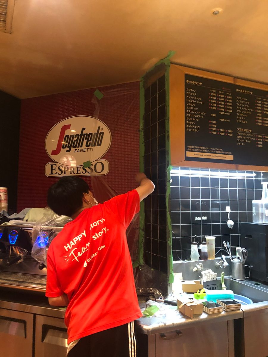 今回は東京都を中心に23店舗のセガフレード・ザネッティ・エスプレッソを運営する同社代表取締役社長の森聡郎氏から依頼を受け、活動に興味を持った岡咲智博さん(建築学科4年次生)、波多野智さん(同)、澤田圭史さん(同)が参加。「気軽に入りやすいカフェ」から「利益を出しつつ高級感のある店にしたい」という森氏のコンセプトに沿って、4名は合成写真やCGを組み合わせてオンライン上でプランを検討し、森氏への提案を重ねるとともに実際の施工の多くも自分たちの手で行いました。相沢さんは、「レジ回りにコーヒー豆や軽食など多くの商品が並び、お客さんの目が散ってしまう印象があったので、内装に用いる色を制限し、商品棚はコンパクトに見せるように変更、照明も変更することで、伝えたい情報が明確になりました。セガフレードは赤、黒、白をイメージカラーとしているので、印象的な赤をより目立たせるために、バーカウンターの赤いタイルの周りに黒のタイルを貼り、天井も黒とグレーに塗るなど視覚面での工夫を凝らしました」と説明します。トイレの白い壁にはグレーの漆喰、奥の壁には黒いタイルを、床にはコンクリートを敷いたほか、施工会社に依頼して入り口の床にはレンガを埋め込み、店の奥の壁にはナポリの風景壁紙を発注から施工まで行い、風景壁紙の周りにはモールディングを施工しました。