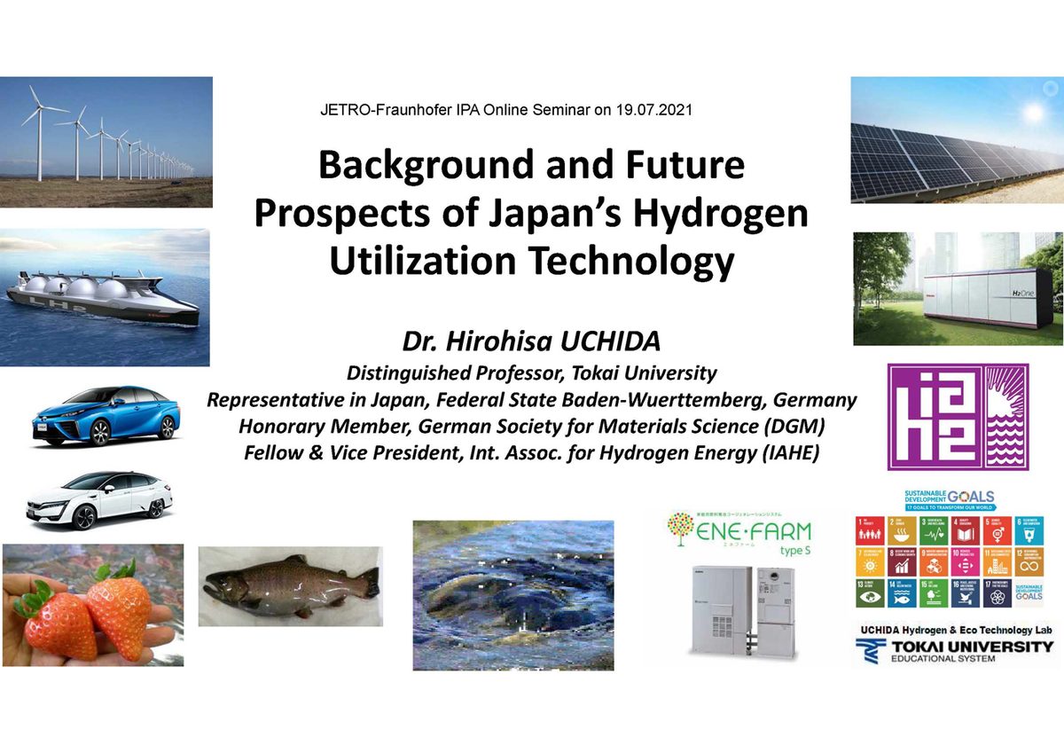 7月19日に開かれた日独水素エネルギーオンラインシンポジウムで、本学の内田裕久特別栄誉教授が基調講演を行いました。日独交流160周年を記念して日本貿易振興機構(JETRO)とフラウンホーファー研究機構の共催で開かれたもの。国際水素エネルギー協会のフェロー・副会長を務める内田教授が「日本の水素利用技術の背景と未来」をテーマに語り、両国から60をこえる企業が参加しました。