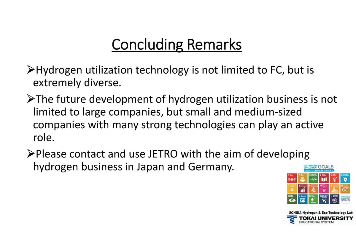 内田教授は国内外の企業による水素の活用例を紹介し、「2018年6月には神奈川県川崎市に世界初となる『水素ホテル』が誕生しました。使用済みプラスチックから水素をつくり出し、ホテルの約30%のエネルギーを供給する、画期的な取り組みです」と説明。自身も工学部の研究室の学生と愛媛県西条市で水素吸蔵合金を活用した農業や魚の養殖に取り組んできたことも紹介しました。「日本の産業技術は世界トップレベルで、大企業では水素の活用も進んでいますが、国家戦略としての取り組みは少なく、海外諸国に遅れをとっています。中小企業でも積極的な取り組みを進め、日本とドイツが連携して水素社会実現に向けて世界をリードしてほしい」とまとめました。