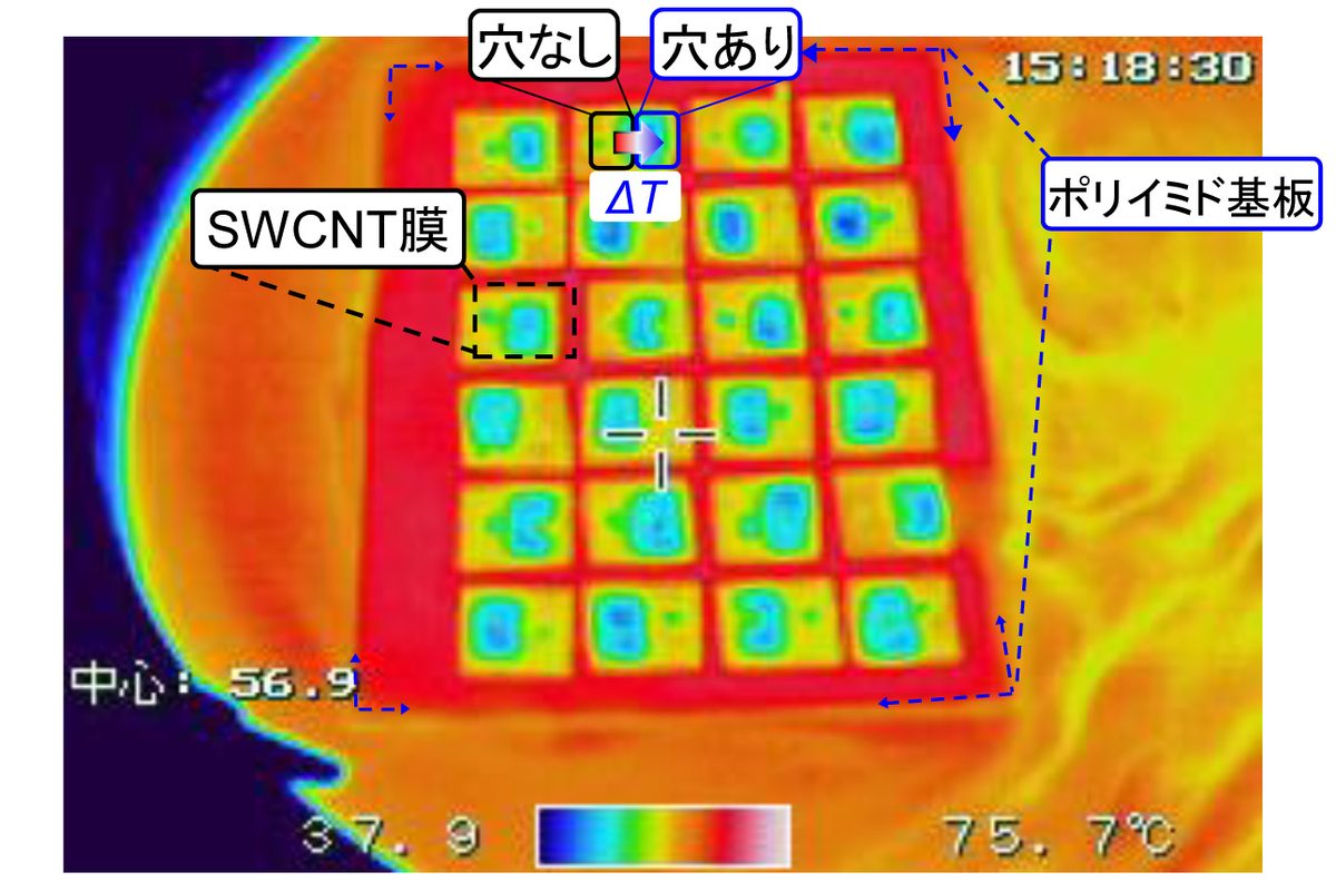 熱電発電デバイスとは、熱エネルギーを電気エネルギーに変換するデバイスで、熱電材料内に発生した温度差から電圧・電力を取り出すことができます。これまでは材料中に温度差を発生させるために、発電デバイスを熱源に取り付ける必要がありました。そこで、高尻教授の研究室に所属する千葉さんらは、筒状炭素分子「カーボンナノチューブ」の膜を使用したデバイスを作成。膜を載せる板に穴をあけ、水に浮かべた際にカーボンナノチューブが水に触れる部分と触れない部分を作り、温度差を生み出すことで熱源を必要としない熱電発電デバイスの開発に成功しました。このデバイスは、昼夜を問わず、水に浮かべるだけで安定した電力を得られることや、風・光量により電力が向上することも分かっており、今後はさまざまなIoTセンサの電源としての応用が期待されます。