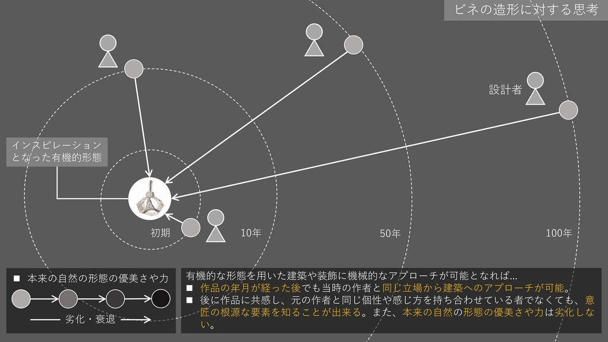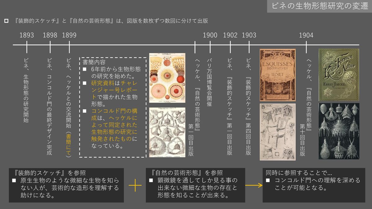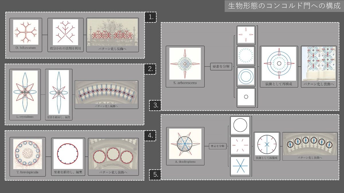 小山さんは、新型コロナウイルス感染症拡大の影響を受けながらもインターネットを駆使して海外の文献や資料を読み込み、渡邉教授の紹介でビネが影響を受けたドイツの生物学者エルンスト・ヘッケルを研究する本学の佐藤恵子名誉教授からも助言を得るなどして研究を進めていきました。「ヘッケルが発見した、顕微鏡を通して初めて確認できる放散虫をはじめとした微細な生物のスケッチと、ビネがコンコルド門に施したデザインが類似していることから、二人の関係性を調べ、やり取りした手紙などから放散虫の外骨格が持つ幾何学的な形態の要素を抽出して再構成したデザインが用いられていることを確認しました。ビネの学生時代の作品からは、放散虫をはじめとする生物の形態を装飾や建築へ取り込む実験的な試みが確認できており、綿密に研究したうえで設計に落とし込んでいたことが考察できます」と話します。「アール・ヌーヴォー潮流における有機的な形態を用いた建築や装飾は、設計者の個性や見方、感じ方によって表現が異なり、後にほかの人が模倣したとしても本来の優美さや力は徐々に分解され、最終的にはなくなってしまうと考えたビネは、機械的に説明できる装飾や建築を目指しました。その中で可能性を見出したのが放散虫といった生物の形態だったのだと考えられます。また、ビネはヘッケルの唱えた一元論思想に共感していたと考えられており、門のデザインのうち、生物の形態に由来しない装飾は、産業や科学技術の発展を表現していることが分かります。さらに、大衆が感覚的に美しいと感じる『単純な美』や『左右対称の美』なども用いられていることから、門全体がヘッケルの唱える『一元的な美』そのものを表現していることも明らかになりました」と話します。