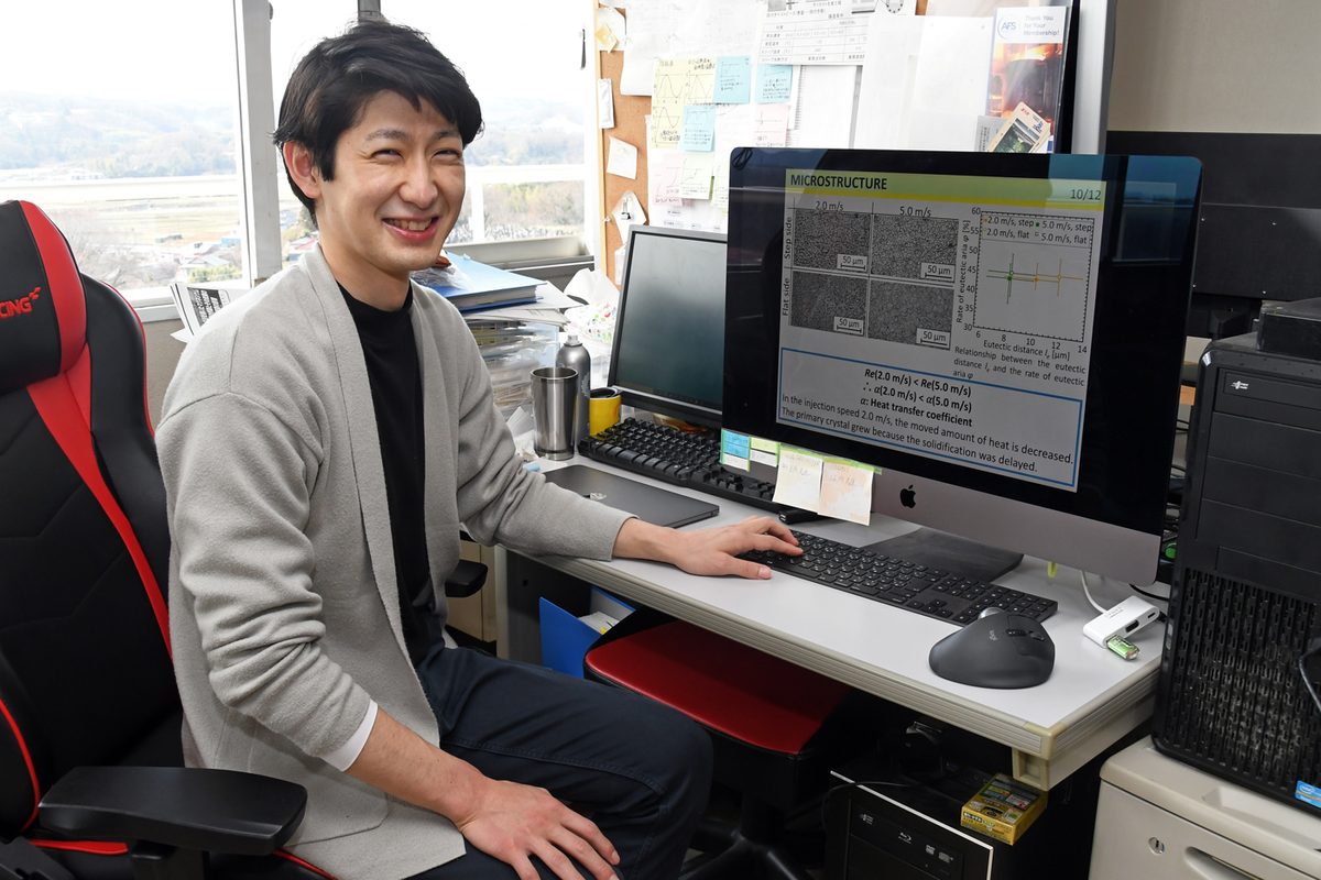 砂見准教授の研究室に所属する柏原さんは、マグネシウムとレアアースを混合し、耐熱性を高めた合金(Mg-RE合金)の加工技術について、旭東ダイカスト株式会社との共同研究に取り組んできました。この合金は、従来のマグネシウム合金に比べて軽量で鋳造しやすく、熱を発生しにくい特性を持つため、電気自動車の材料などとして期待されています。マグネシウム製自動車部品は、溶かした非鉄金属の合金を精密な金型に高速・高圧で注入し、瞬時に製品を成形する鋳造技術「ダイカスト」によって生産します。今回の論文では、金型に射出する速度を速め、金属の温度も上げることで、強度の高い合金を成形できることを報告。鋳物試料に対し、X線CT内部計測、引張試験、凝固組織観察を行い、材料特性の発現要因を検討した成果もまとめました。