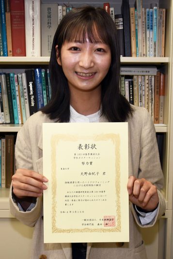 大学院工学研究科機械工学専攻1年次生の天野由紀子さん(指導教員=工学部機械工学科・窪田紘明講師)が3月16日にオンラインで開催された日本鉄鋼協会2022年春季学生ポスターセッションで努力賞を受賞し、このほど表彰状が贈られました。同セッションは多くの学生に発表の機会を提供することを目的に開かれているもので、今回は日本各地の29大学・短期大学・高等専門学校から70件の発表があり、最優秀賞1件、優秀賞7件、努力賞15件が決定。天野さんは大学院生が上位を占める中で学部生(当時)ながら受賞を果たしました。