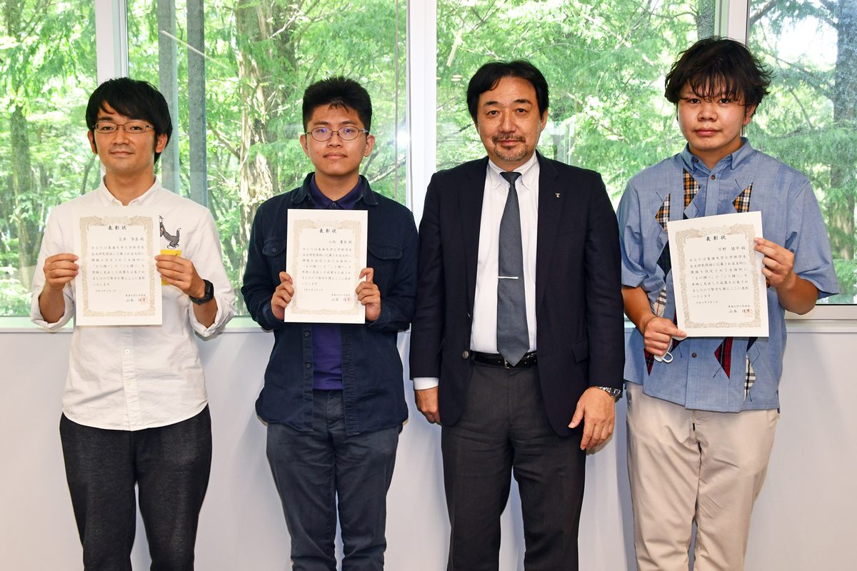 工学部では7月7日に湘南校舎で、学生自身が設定した自由な課題に挑む「学生自主研究奨励」の表彰式を行いました。大学の授業や身の回りの出来事の中で感じる疑問や関心から研究の種を膨らませ、芽吹かせていく学生を応援しようと2018年からスタートした取り組みです。学生たちは毎年9月にエントリーし、12月末に報告書を提出。今回は下野慎平さん(工学部3年次生)、小池鷹生さん(同4年次生)、荒井杏真さん(大学院工学研究科1年次生)が応募し、山本佳男学部長から表彰状と記念品が手渡されました。