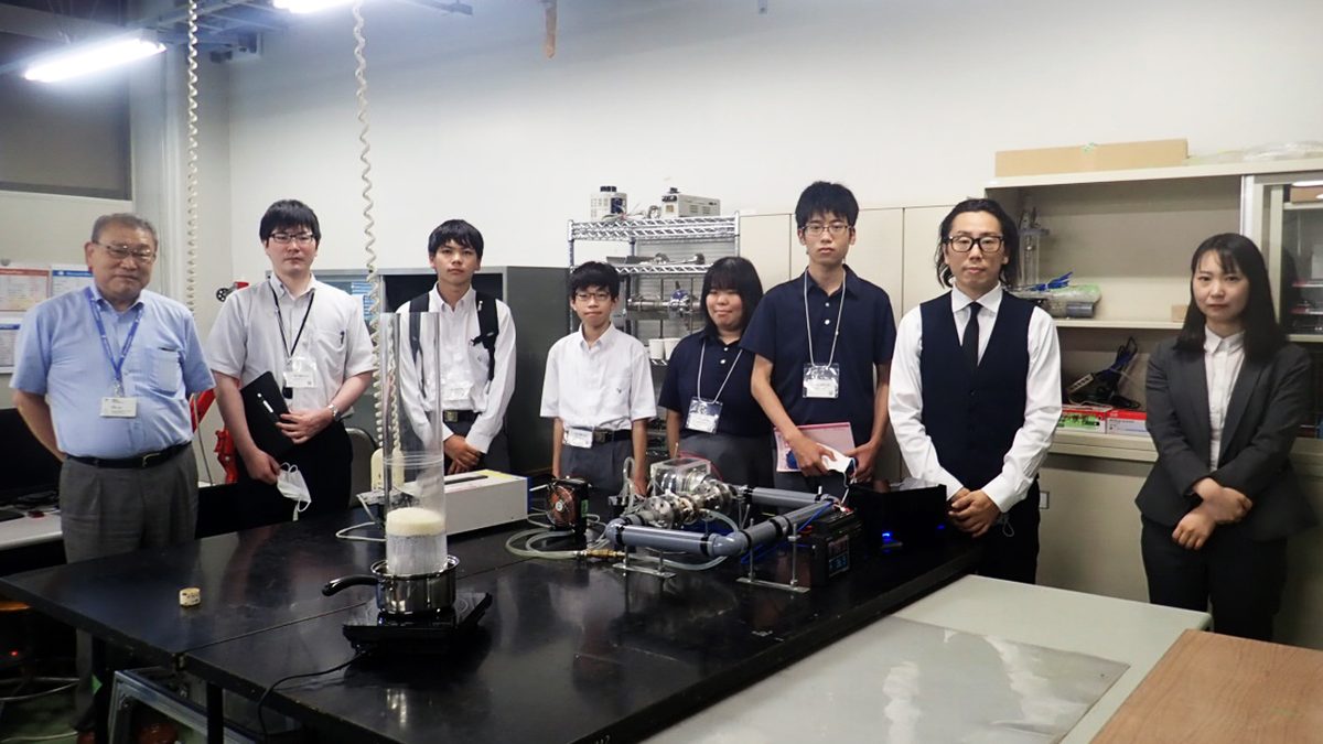 総合科学技術研究所の長谷川真也教授(工学部機械工学科兼任)の研究室に7月22日、神奈川県・相洋高校理科部の生徒4名と教員が訪れ、熱音響機関などを見学しました。昨年12月に開催された「小田原白梅ライオンズクラブ・早稲田大学 科学コンテスト」で相洋高理科部の吉際雛乃さん(1年=当時)が「音発電」について発表し、「高校の部」で最優秀賞を受賞。科学への関心を高めてもらおうと、審査員を務めた本学の稲津敏行副学長(理系担当)が主催者を通じて、類似研究に取り組む長谷川教授を紹介したことがきっかけで実現しました。