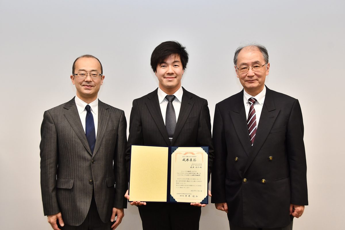指導にあたった落合教授は、「新型コロナ禍で研究ができない期間があったものの、その時間を挽回するかのように取り組んでいた姿が印象的でした。私たちのこれまでの研究や同期の研究などに関心を持ち、さまざまな側面から考えることができる梶木君だからこそ、AICEの研究者から興味を示してもらえたと感じています」と振り返り、畔津教授は、「フォトクロミズムで広範囲を可視化する研究はしてきましたが、今回のように狭い場所を具体的に見るのはさまざまな技術や細かな微調整が必要とされます。多くの苦労の末、成し遂げた研究成果が評価されてうれしい」と話していました。