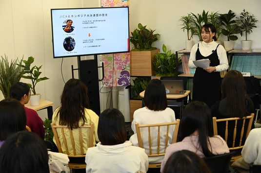 当日は、本学科2年次生、教養学部国際学科3、4年次生約20人が出席。沖田さんは、在学中に国際学科で学びながら水泳部にも所属した経験を振り返り、「幼いころから国際協力活動に携わりたいという夢と、大好きな水泳で結果を残したいという思いを抱いていました。水泳部の練習はハードでしたが、水泳部の仲間やコーチだけではなく、国際学科の指導教員だった小貫大輔教授や友人たちのサポートもあり、4年間で2つの目標を追い続けることができました。水泳部では、4年時のジャパンオープンの50m平泳ぎで4位になれました」と振り返りました。卒業後は海外協力隊員としてカンボジアへ渡り、現地の選手を指導。「練習場所は日本では考えられない緑色のプール。コースロープもなければ、ビート板などの道具もない。それでも、目を輝かせ、楽しそうに泳ぐ代表選手に“この子たちのためにできることは何でもやろう”と決めました」と話し、「辛いことや葛藤もたくさんあったけど、乗り越えられたのは目標が明確だったから。選手たちと一緒に描いた夢と彼らの可能性を、最後まで信じ抜く気持ちを強く持ち続けました」と話しました。