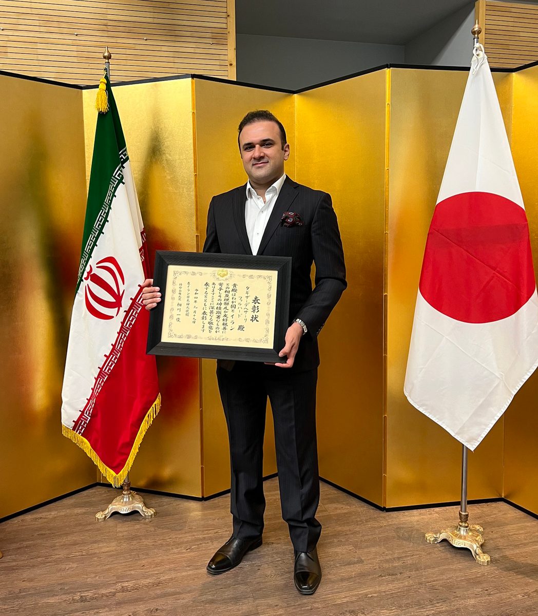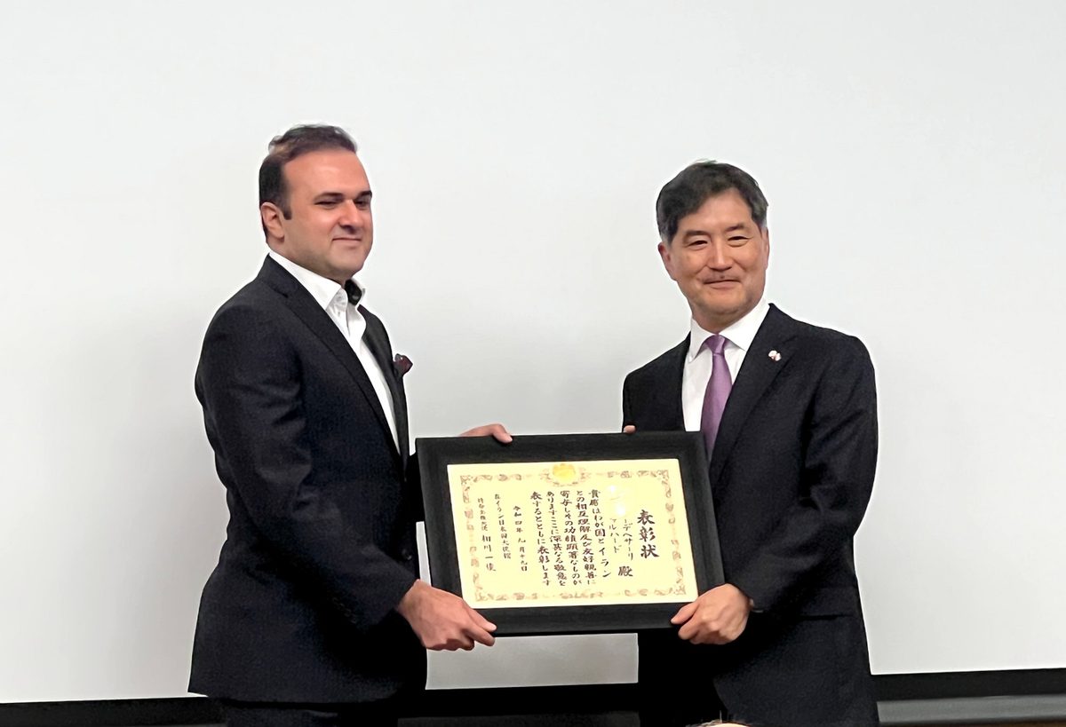 大使館で開かれた表彰式では、相川一俊特命全権大使から賞状が授与されました。タギザーデ准教授は、「文部科学省の奨学生として、また東海大学の教員としてこのような貴重な表彰を受け感激しています。両国間における科学的共同研究の推進に寄与することができ、これまで以上に熱意を持って研究を続けていこうという気持ちになりました。また、このような賞は日本人と外国人の相互理解を深めるために必要なものだと思います」と喜びの気持ちを述べました。また、「私はこれまで母国であるイランや日本など、さまざまな国の研究者と共同研究を計画・実施しており、現在はSDGsやカーボンニュートラル、エネルギーと食料の安全保障、グリーン開発など、日本とイランにとって有益となる研究を進めています。経済学者である私にとって、人々の生活の質を向上させる実用的な研究テーマを選択することはとても重要なことです。今後も自身の研究や学生の教育に従事し、故郷のように大切に思っている両国の社会に貢献したいと考えています」と語っています。
