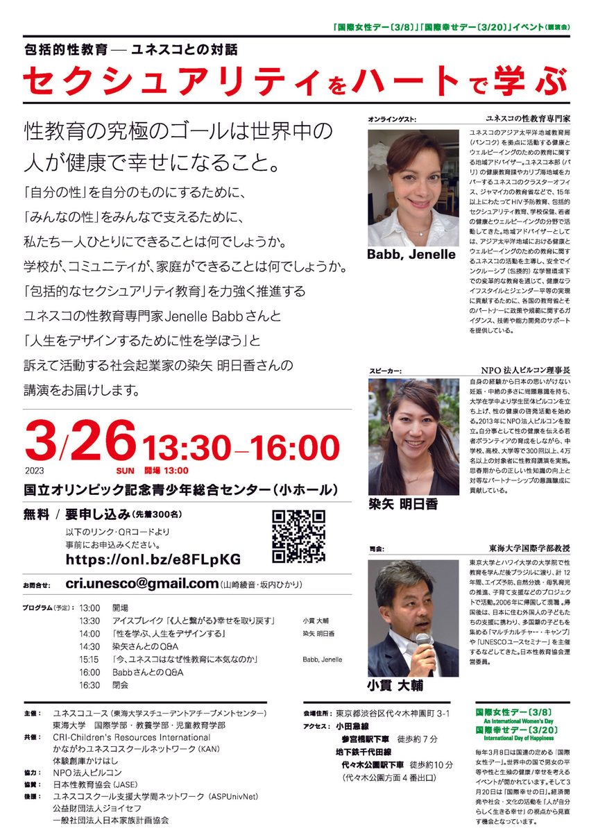 性教育の究極のゴールは世界中の人が健康で幸せになること。「自分の性」を自分のものにするために、「みんなの性」をみんなで支えるために、私たち一人ひとりにできることは何でしょうか。学校が、コミュニティが、家庭ができることは何でしょうか。「包括的なセクシュアリティ教育」を力強く推進するユネスコの性教育専門家Jenelle Babbさんと「人生をデザインするために性を学ぼう」と訴えて活動する社会起業家の染矢 明日香さんの講演をお届けします。