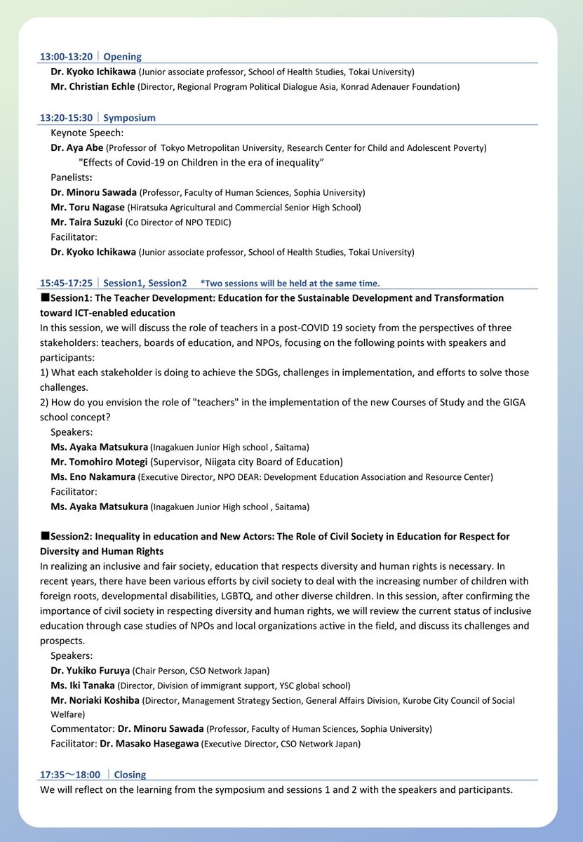In order to achieve the SDGs’ goal of “quality education for all”, it is necessary to address educational and social inequality in Japan. We will discuss the transformation, new systems, and new ways of collaboration to create a symbiotic society in the post-COVID-19 society.