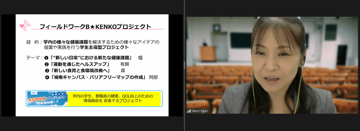 健康学部健康マネジメント学科では11月25日にオンラインで、2021年度第1回KENKOセミナー「学部をまたいで予防について考えてみませんか!?」を開催しました。QOL向上を目指して健康を多角的・多面的にとらえた活動を展開している東海大学KENKOプロジェクトとの共催により、学生や教職員の健康とよりよい環境づくりのために正しい知識を身につけてもらおうと開いているものです。今回は、初めて本学部と医学部の学生を対象に実施。両学部の学生約20名が、医学部医学科の豊田雅夫准教授(医学部付属病院腎内分泌代謝内科第一診療センター長)と健康学部の森真理准教授の講演を聴講し、グループディスカッションで学びを深めました。