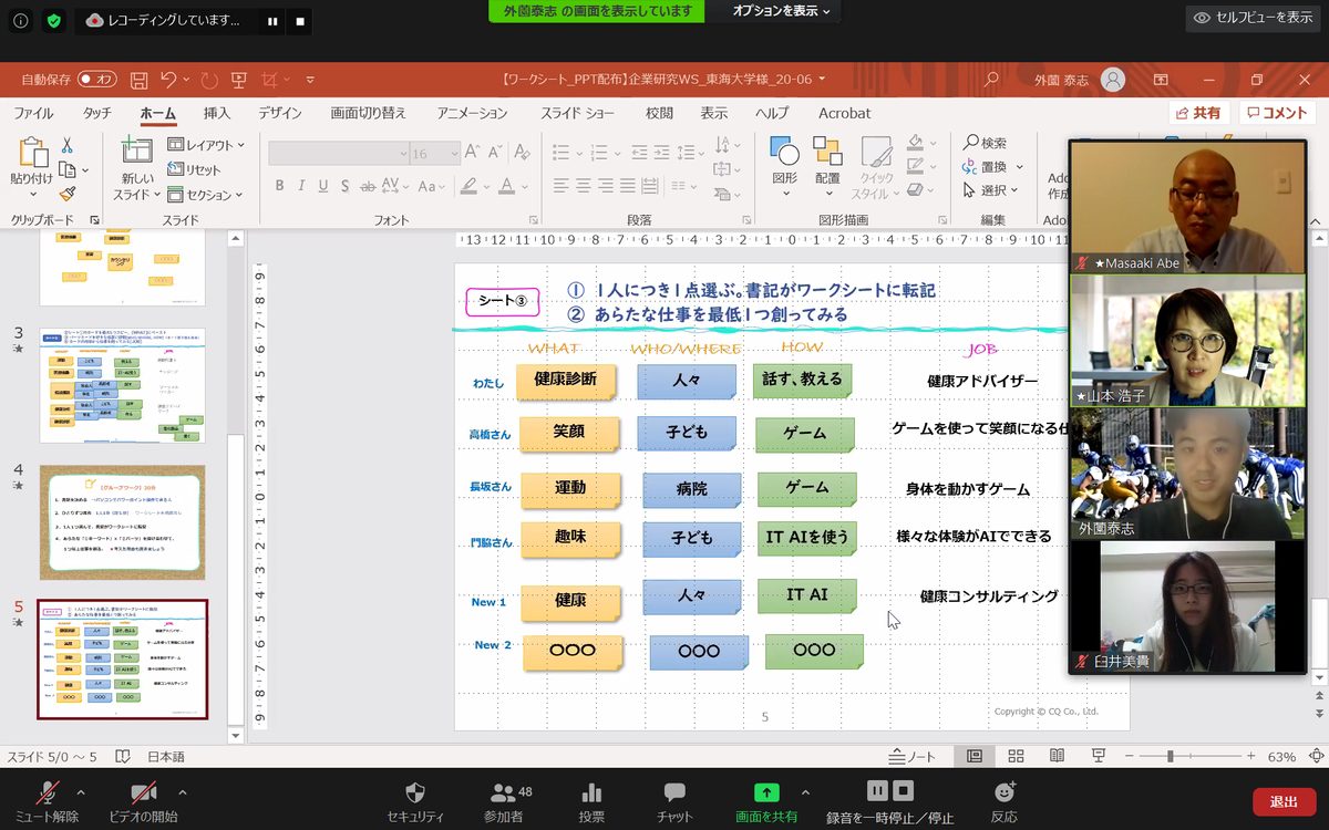 続いて「しごと創出ワーク」として、Zoomの「ブレイクアウトルーム」を使って、4、5名のグループに分かれてワークショップを実施。各自が「健康」に関するキーワードを書き出した後、自然、病院、高齢者、在宅ワーカーといった「WHO/WHERE」のカードと、話す、IT・AIを使う、ゲーム、電化製品といった「HOW」のカードを組み合わせ、「食×子ども×教える=食育アドバイザー」といったように興味・関心がどのような仕事に結びつくかを考えました。