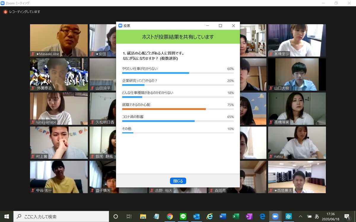 はじめに、本学部キャリア支援委員会の阿部正昭教授が大学の支援体制などを紹介した後、山本氏がアイスブレイクとして日常生活に関することのほか、「就活の心配事がある」「何が気になるか」などをZoomの投票機能を使って学生たちに質問。「就職できるのか心配」「コロナ禍の影響」といった声が多く上がりました。講演では、就職活動のスケジュールや「業界と職種の違い」といった就職活動の基礎知識を紹介。「自分に合った仕事を見つけるためには、横に広い知識と視野、縦に深い専門知識を持った『T型人材』を目指してください」とアドバイスを送り、「新型コロナウイルスの感染拡大による”コロナショック”は100年に一度の大変革期をもたらしました。巣ごもりや衛生、非接触をキーワードにしたビジネスが伸び、移動・接触が必要なビジネスは衰退していく。企業は体質を変えられるかによって2分化されていくでしょう。就職活動もオンラインで行われるようになり、職種によりますが、オンラインツールを使ったプレゼンテーション能力も問われるようになってきました。表情や背景などの映り方も大切ですが、考えを資料にまとめ論理的に説明する力も問われています」と語りました。