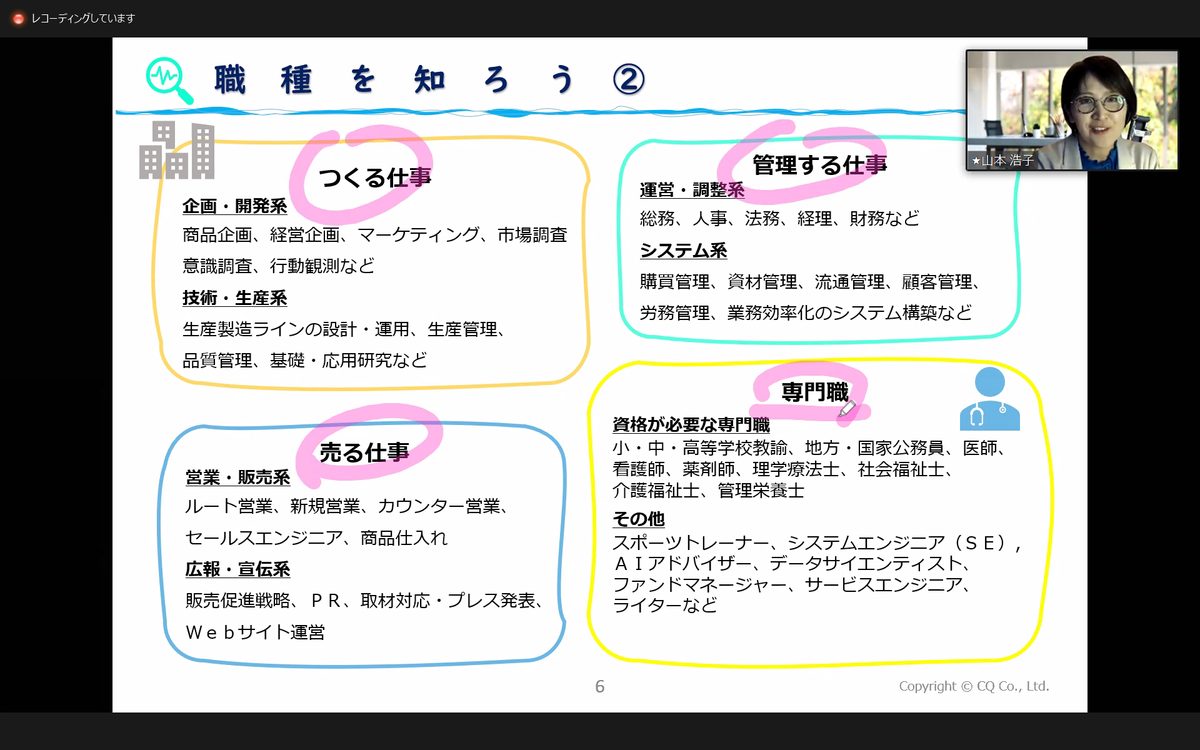 健康学部では6月18日にWEBビデオ会議システム「Zoom」を使って、キャリア支援企画「新型コロナ禍に勝つ!企業選びのコツ―健康学部の企業研究ワークショップ―」を開催しました。本学部の1期生が3年次生となり、就職活動本番を控えていることから、早い段階から準備をすることで希望する進路に進めるようサポートしようと企画したものです。大学生のキャリア支援などを手がける株式会社CQ代表取締役の山本浩子氏を講師に招き、3年次生約50名が参加しました。