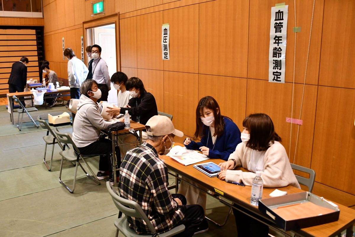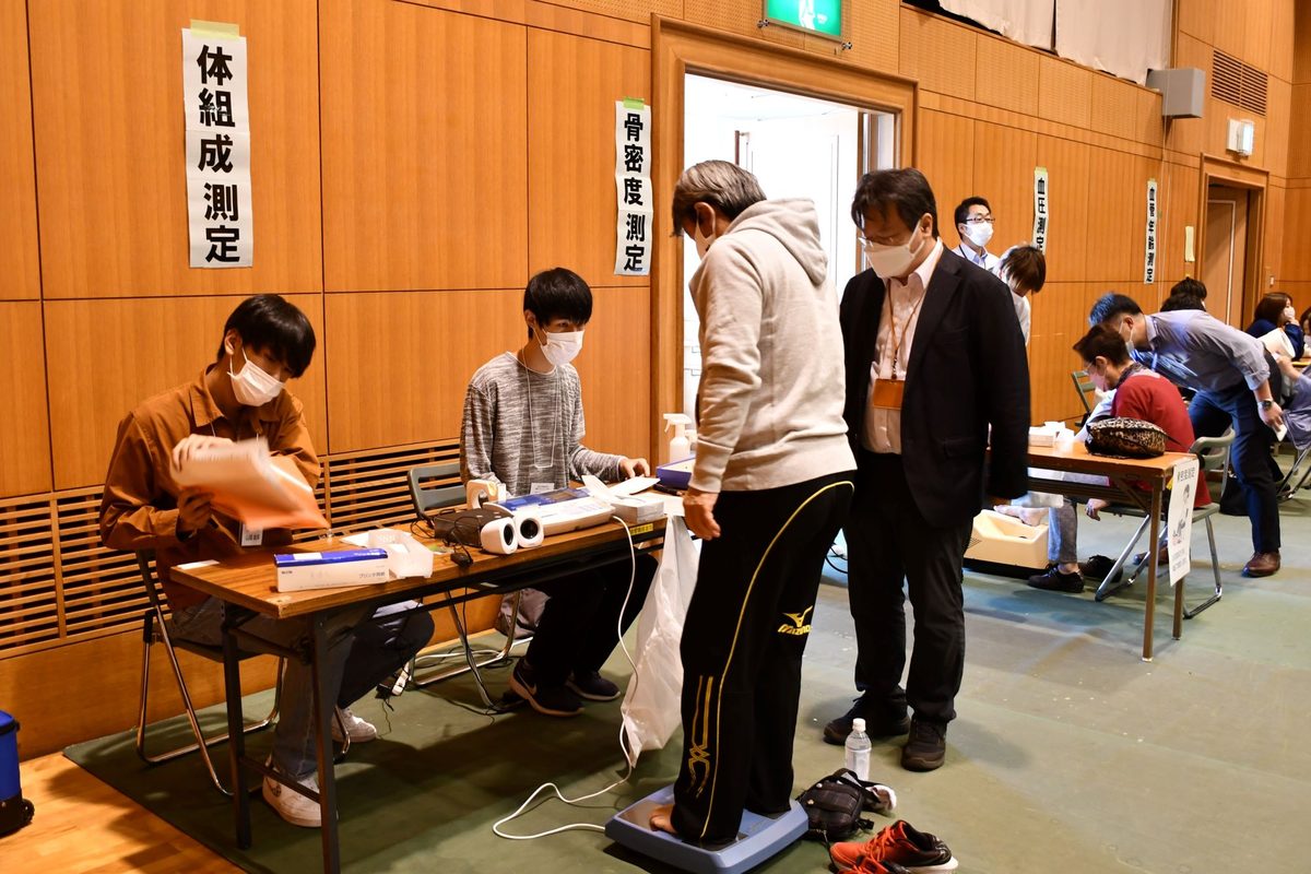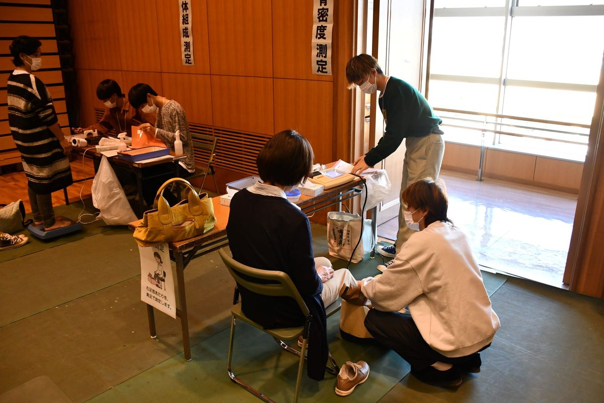 秦野市保健福祉センターで開催した11月4日には、9名が参加。体組成と骨密度、血管年齢、血圧の測定のほか、合図とともに椅子から立ち上がって下肢のパワーとスピード、バランスを評価する運動機能分析器の測定結果の説明や運動に関するアドバイスも担当しました。さらに、保健師や管理栄養士による測定結果の個別説明に同席し、健康指導の方法についても学びました。