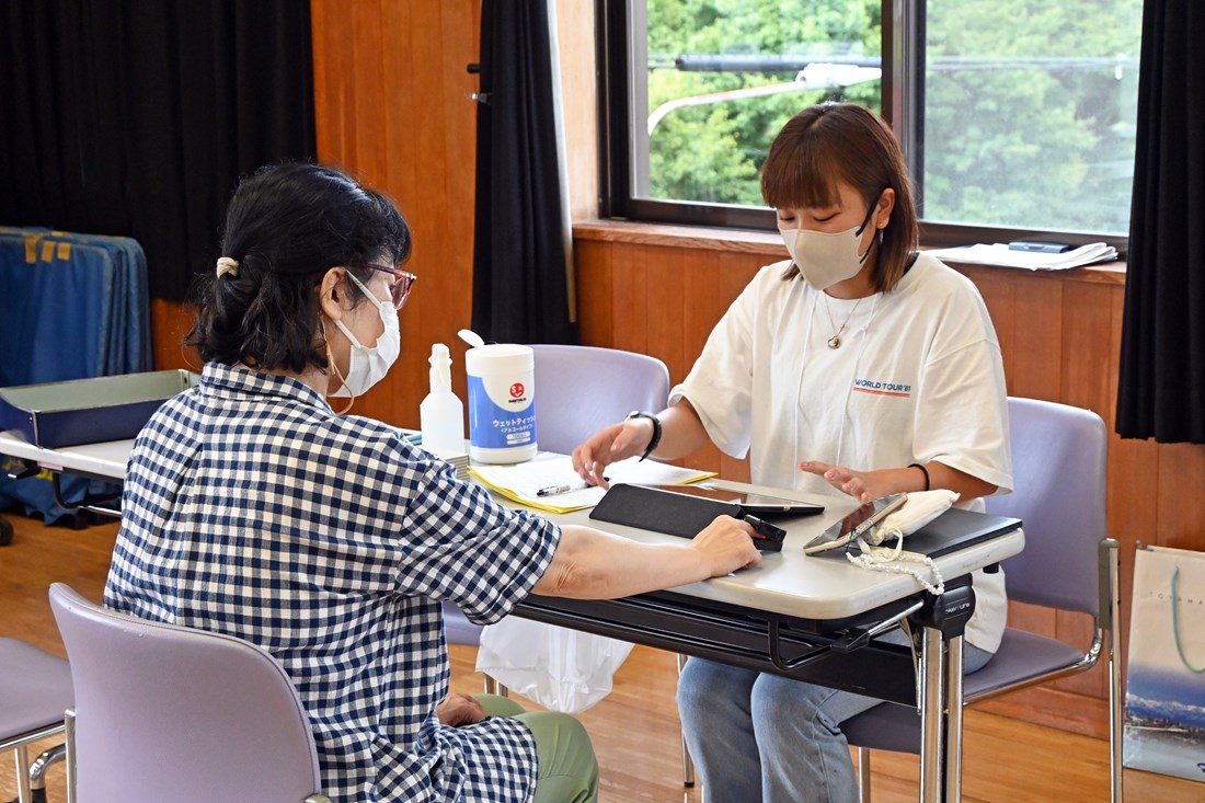 9月8日に秦野市立上公民館で開催した測定会には、22名の地域住民が来場しました。今年度3回目の開催で、1回目は大根公民館にて48名、2回目は東公民館にて46名が来場しました。10名の学生が、体組成と骨密度、血管年齢、血圧を測定したほか、合図とともに椅子から立ち上がる際のパワーとスピード、バランスを評価する運動機能分析器の測定結果を説明し、運動に関するアドバイスも担当しました。さらに、秦野市の保健師や管理栄養士による測定結果の個別説明に同席し、健康指導の方法についても学びました。来場者は、「近所の公民館で自分の健康状態をチェックしてもらえて非常にありがたい」「学生さんが親切に接してくれてうれしかった」と話していました。