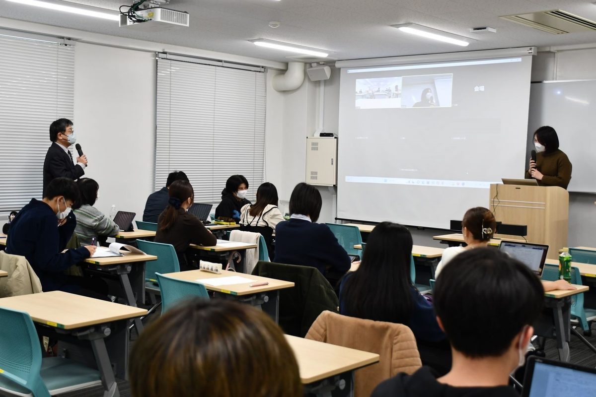 11月10日には、地域・行政機関で実習した成果の報告会を実施しました。初めに、指導する長沼洋一講師が登壇し、「新型コロナの感染状況を確認しながら臨機応変に対応してくださった実習施設の方々に感謝します。学生たちは終了後も、振り返りやグループワークを通じて学びを深めてきました。今後に向けて、ぜひ指導者の皆さんからのフィードバックをお願いします」とあいさつしました。