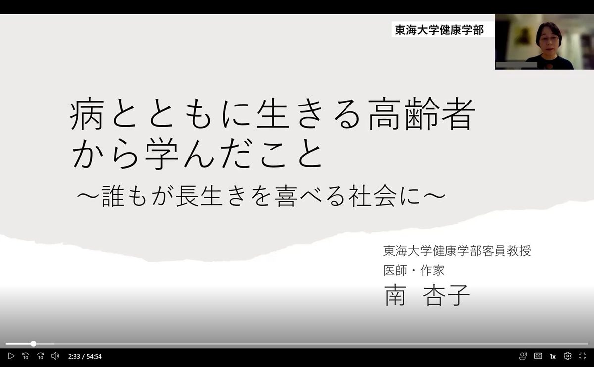 健康学部健康マネジメント学科では、本学医学部卒業生で医師・小説家の南杏子客員教授による講義「病とともに生きる高齢者から学んだこと~誰もが長生きを喜べる社会に~」を、11月29日から12月3日にかけてオンラインで配信。「高齢者と福祉」の授業を履修している学生、約180名が視聴してレポートを作成し、12月8日の授業で中野いずみ教授が講評しました。