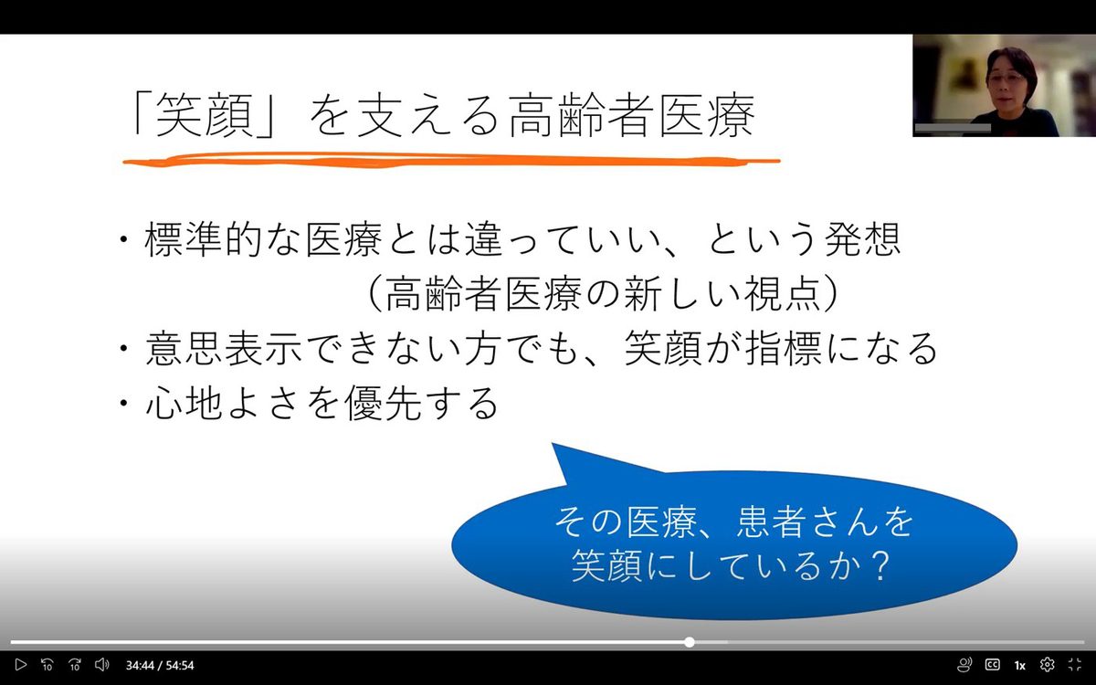 南客員教授は病とともに生きる高齢者の実例として、脱水と低栄養になって病院に運ばれた90歳A子さん、脳梗塞で左半身麻痺になった82歳B雄さん、アルツハイマー型認知症を発症した85歳C美さんについて医療体制などを説明。加齢によって要支援・要介護になる可能性が高い状態を「フレイル(虚弱)」と呼び、足、口、頭の衰えがその原因になると解説し、「長生きの結果、生命活動を終えるのは自然な現象です。足、口、頭の衰えは誰にでも起きることであり、限界を受け入れ、現状に即した対応が最終的には患者さんのためになります。老衰を前提とした医療、介護、生活が、患者さんを笑顔にし、老衰死を支える環境になります」と話しました。また、社会の役に立っていると感じられる「貢献寿命」を伸ばす必要性や、長生きを喜べる社会づくりの重要性について語り、「介護を受ける不安を解消する仕組み、要介護状態でも楽しめる環境、迷惑にならないシステム、感謝される環境の機会をつくることで貢献寿命を延ばすことができるのでは」とまとめました。