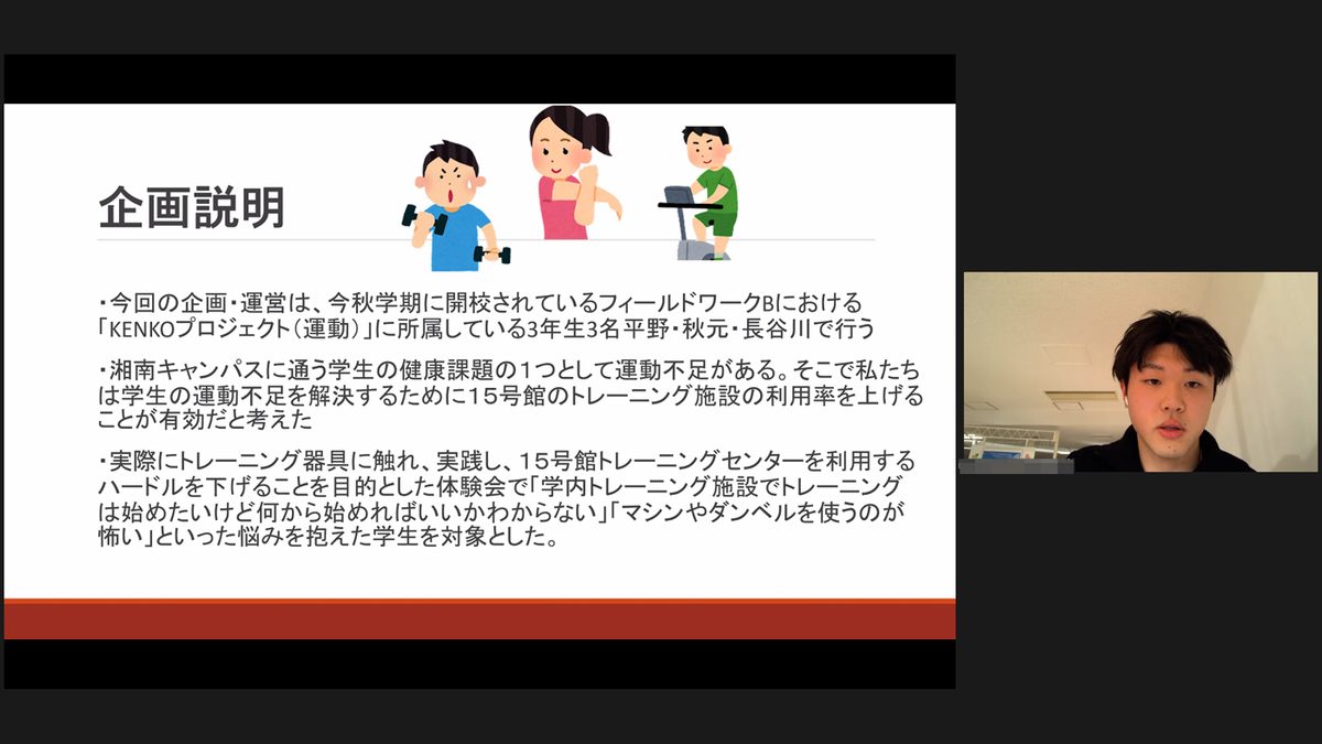 健康学部健康マネジメント学科では1月17日に、「フィールドワークB」の報告会をオンラインで行いました。身近な課題を発見し、自主的な調査・研究を経て解決を目指す授業で、学生たちは9つのプロジェクトに分かれて取り組んできた成果を発表。約80名が参加しました。