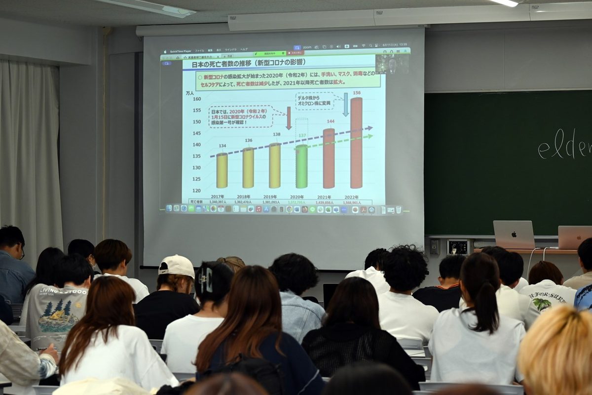 講義でははじめに、「新型コロナウイルスから学んだこと」と題して近年の日本の死亡者数を示したグラフを用いて解説。新型コロナが蔓延した2020年は、前年と比べて死亡者数が減少したものの、21年以降は特に70歳以上の死亡者数が増加し、「外出を自粛するあまりに免疫力が衰えて老衰する人が多くなりました。ワクチンだけに頼るのではなく、自らの免疫力を高める行動が最も大事だと新型コロナが教えてくれました」と話しました。