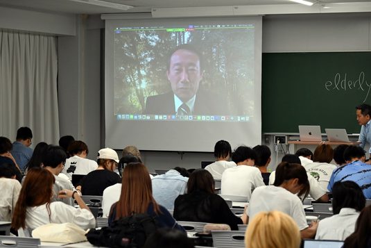 受講した学生たちは、「高齢化には悪いイメージを持っていたけど考えが変わりました。現在の社会に合わせた新しい保障制度が必要」「高齢者の方との関わりを持つことが、健康予防にもつながるのが印象的だった」と話していました。科目責任の健康マネジメント学科長の小林理教授は、「2年次生以降は、外部でのフィールドワークやボランティア活動など、教室だけの学びに収まらず『社会と関わること』もテーマになります。江崎客員教授からいただいたメッセージを今後の学びにつなげてもらいたい」と語りました。