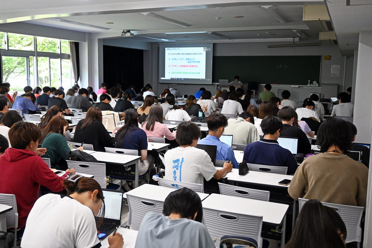 健康学部健康マネジメント学科では6月11日に湘南キャンパスで、社会政策課題研究所所長で本学客員教授の江崎禎英氏による講義「健康長寿社会への挑戦」を実施しました。本学科の必修科目である「健康学概論」の一環として、本学科の1年次生約200名が聴講しました。