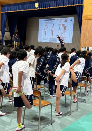 初めに「中学生で起こりえるケガの原因を知り、予防法を実践できるようになることが今日の目標です」と語りかけた遠藤助教は、ケガの種類や原因、中学生の体の特徴、骨の成長の仕組みのほか、予防のためのストレッチングも紹介。本学科の学生有志による運動指導勉強会「KEITH」のメンバーである吉川叡史さん(4年次生)もアシスタントとして登壇し、椅子に座った状態でできるストレッチングのデモンストレーションを行い、生徒も一緒に実践しました。遠藤助教は、「骨がもろくなればけがのリスクは高まります。カルシウムやビタミンD、Kを摂取するよう心がけ、日光をよく浴びることも大切です。ケガの予防には体を動かすだけでなく、食事や睡眠などの生活習慣も重要です」と多面的にアプローチすることの重要性を伝えました。さらに、専門であるコンディショニング科学の視点から、ストレッチング以外にも入浴や振動刺激など生活の中で実践できる方法や、万が一ケガをしてしまった際に行う救急処置法(RICE処置)について紹介しました。