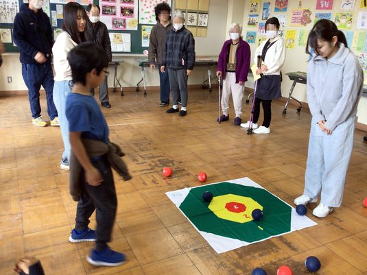 ボッチャは2チームに分かれ、的に向かって交互に球を投げて得点を競うシンプルなゲームです。妻鹿教授ゼミでは昨年度から、広畑ふれあいプラザでのデイサービスでボッチャ教室を開催してきました。毎回、多くの高齢者が参加して盛り上がることから、デイサービスを運営する秦野市役所高齢介護課から今回のイベントへの協力依頼がありました。当日はゼミの4年次生5名が参加し、ルールの説明や運営をサポート。約20名が入れ替わりで参加し、30ゲームを行うなど大盛り上がりを見せました。中神晶太朗さんは、「ルールを説明するときは目線を合わせてゆっくり大きな声で話すようにしました。社会福祉士の勉強をしているので、これまで学んできたことが現場で生かせていると感じました」とコメント。山田晏さんは、「普段は高齢者の健康維持を目的にしていますが、今回は親子連れや小さい子どもも多かったので、楽しんでもらえるよう意識しました」と語りました。森岡みなみさんは、「今回のイベントには参加できませんでしたが、世代間交流をテーマに卒論を書いているので、デイサービスでのボッチャ体験には何回も参加しています。皆さんにインタビュー調査をさせてもらい、研究にも生かせています」と話していました。