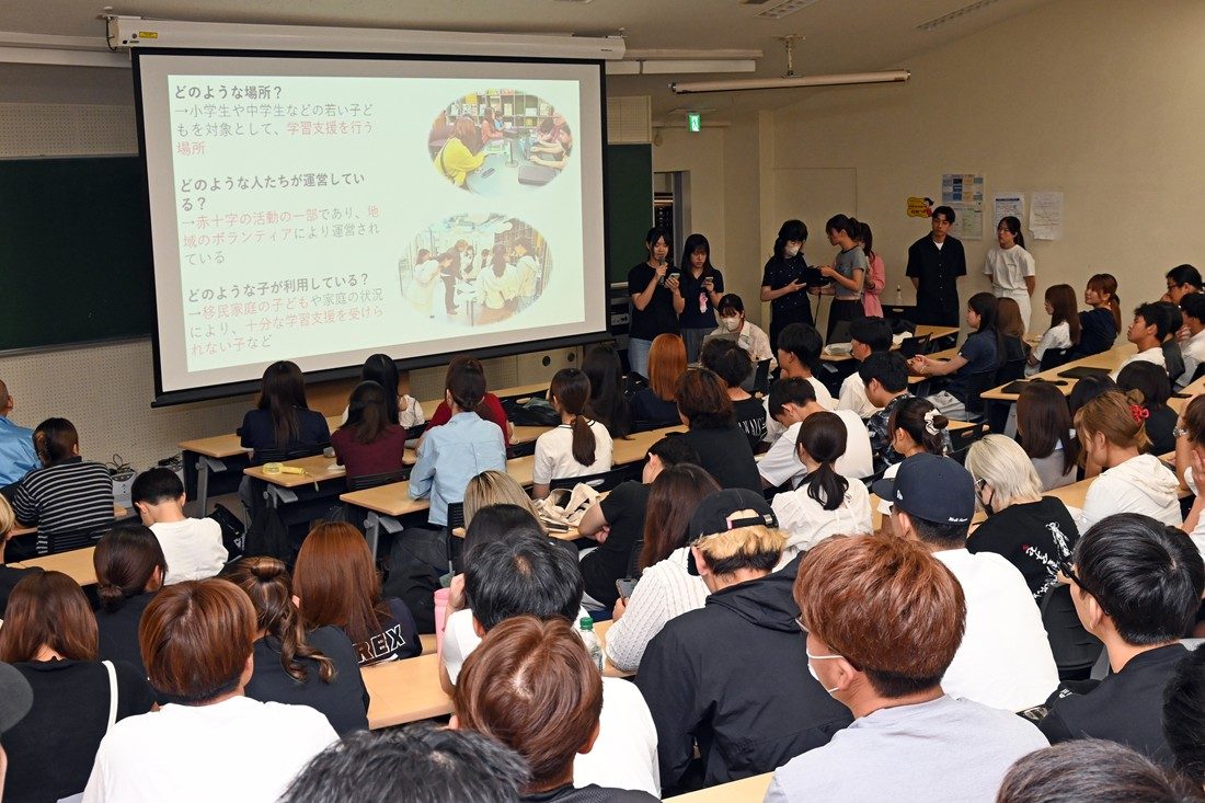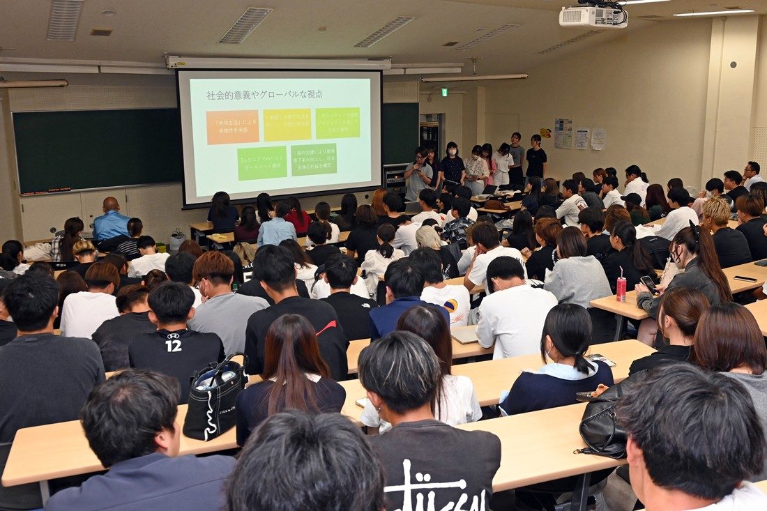 1年次生の必修科目「入門ゼミナールB」の教室で実施した報告会では、研修に参加した9名の学生が順番にマイクを持ち、用意した資料をもとに発表しました。多様性を受け入れる交流の場である「ホームワークカフェ」や地元住民だけでなく観光客も訪れる「コミュニティキッチン」では、現地住民と交流した様子を紹介。17歳以上が入学可能な全寮制の国民高等学校「望星フォルケホイスコーレ」について発表した学生は、「互いの文化や価値観の違いを認め、尊重する姿勢や言語の壁を乗り越えたコミュニケーションなど、生きる力を学ぶ場だと感じました。日本以上にコミュニケーションが重視されていました」と話しました。