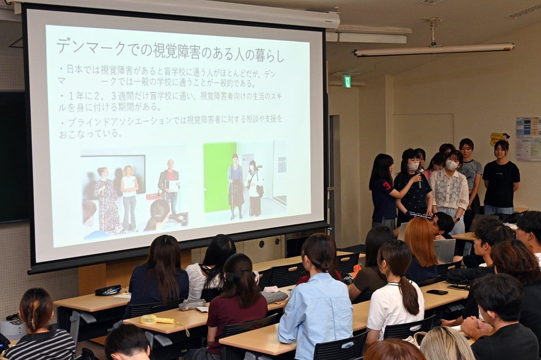 初日には、コペンハーゲンにある視覚障がい者による団体に訪問したことを受けて、視覚障がいのある参加学生からは「デンマークでの視覚障がいのある人の暮らし」について発表し、「一般の学校に通い、年に2~3週間、生活のスキルを身に着けるために1校しかない盲学校に行きます。ノーマライゼーションという考え方が根強く、インクルーシブ教育が進んでいると感じました」とまとめました。また、高齢者の入居施設について発表した学生は、尊厳を持って充実した生活を送れるようにサポートされている様子を紹介。さらにコペンハーゲン大学で公衆衛生についての講義を踏まえて、デンマークの医療制度と公衆衛生問題についても触れ、家庭医が最初の窓口になり、そこから専門医や病院を紹介するといった日本との違いについても解説しました。学生たちは、「デンマークでは一人ひとりの自主性や個性、価値観が尊重されており、人々は交流や繋がり、助け合いを大切にして、自分らしい人生を歩んでいくという考え方を持っていました。研修に参加して英語力が向上しただけでなく、交流を通じて健康意識やコミュニティ、教育、福祉のあり方について考えることができました」と話していました。