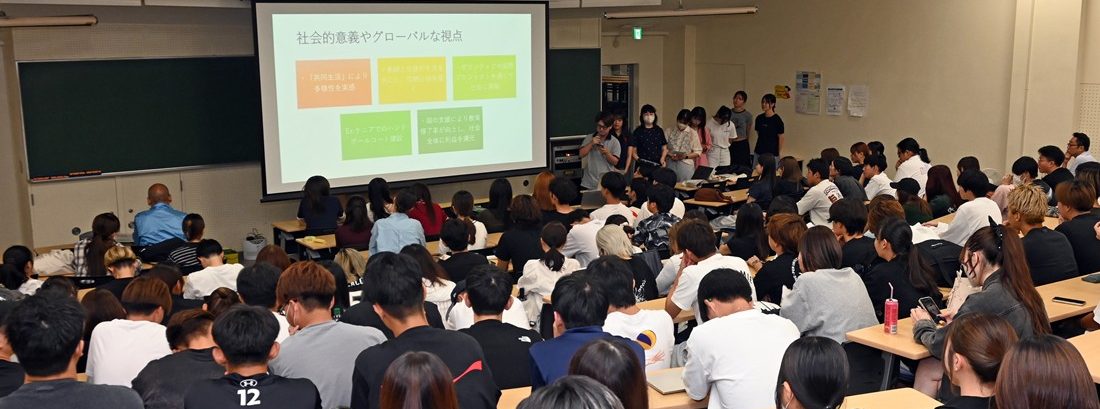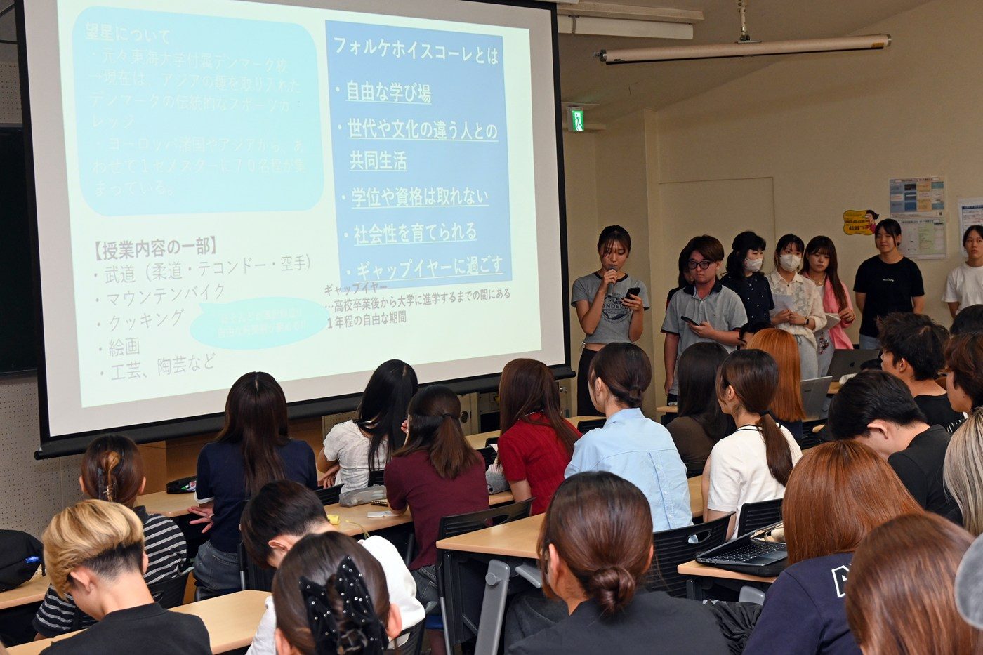 1年次生の必修科目「入門ゼミナールB」の教室で実施した報告会では、研修に参加した9名の学生が順番にマイクを持ち、用意した資料をもとに発表しました。多様性を受け入れる交流の場である「ホームワークカフェ」や地元住民だけでなく観光客も訪れる「コミュニティキッチン」では、現地住民と交流した様子を紹介。17歳以上が入学可能な全寮制の国民高等学校「望星フォルケホイスコーレ」について発表した学生は、「互いの文化や価値観の違いを認め、尊重する姿勢や言語の壁を乗り越えたコミュニケーションなど、生きる力を学ぶ場だと感じました。日本以上にコミュニケーションが重視されていました」と話しました。