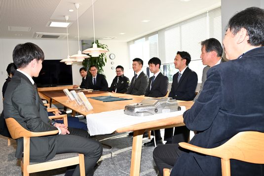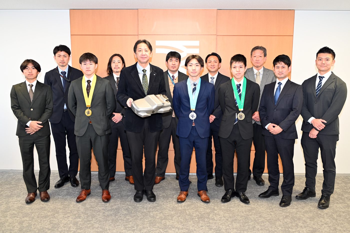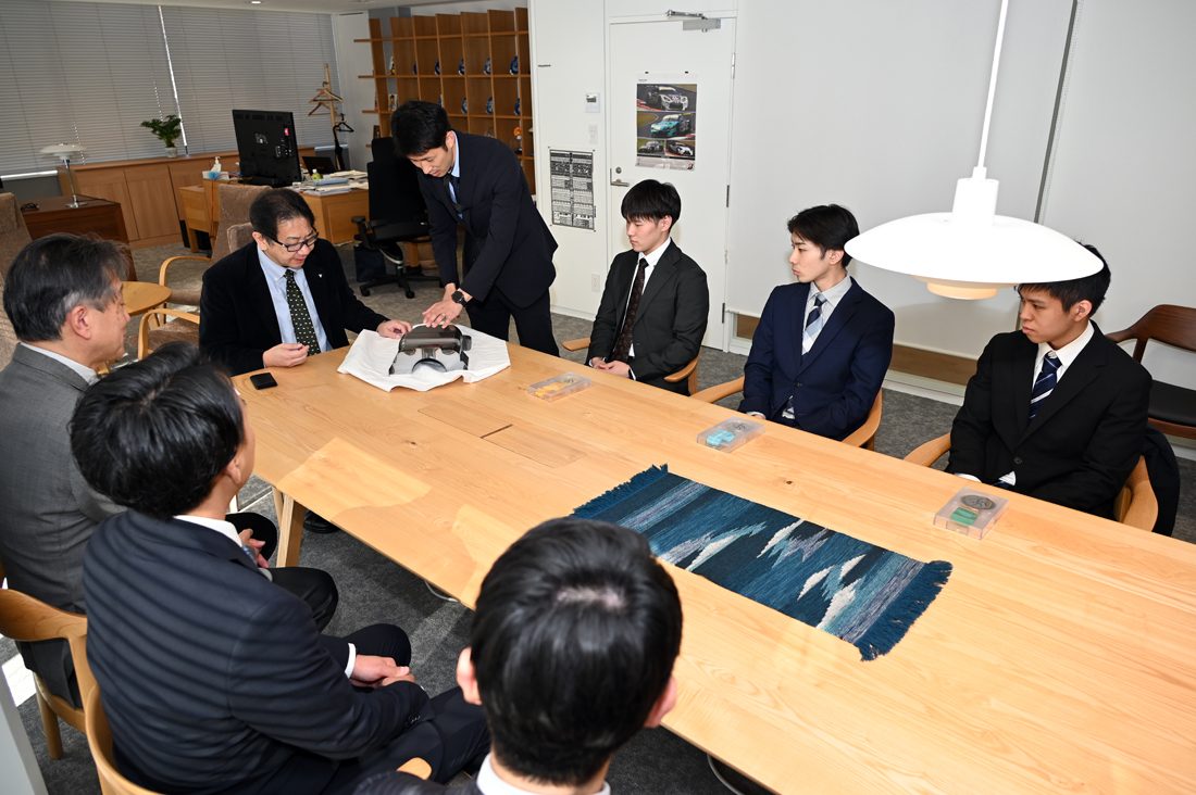 スポーツ医科学研究所と健康学部の教員が、10月に開催された第63回技能五輪全国大会の自動車板金職種で金賞受賞など多数の入賞を果たした日産自動車株式会社の自動車板金チームをサポートしています。技能五輪は、国内の青年技能者(原則23歳以下)を対象に、機械の組み立てや工作、金属加工、建設、電子技術、情報通信、サービス・ファッションなど幅広い職種で、多様な技術の習熟度を競う大会です。12月8日には、同チームの受賞選手や選手たちをサポートする日産テクニカルセンターの関係者やコーチ陣が湘南キャンパスを訪問。木村英樹学長と懇談しました。